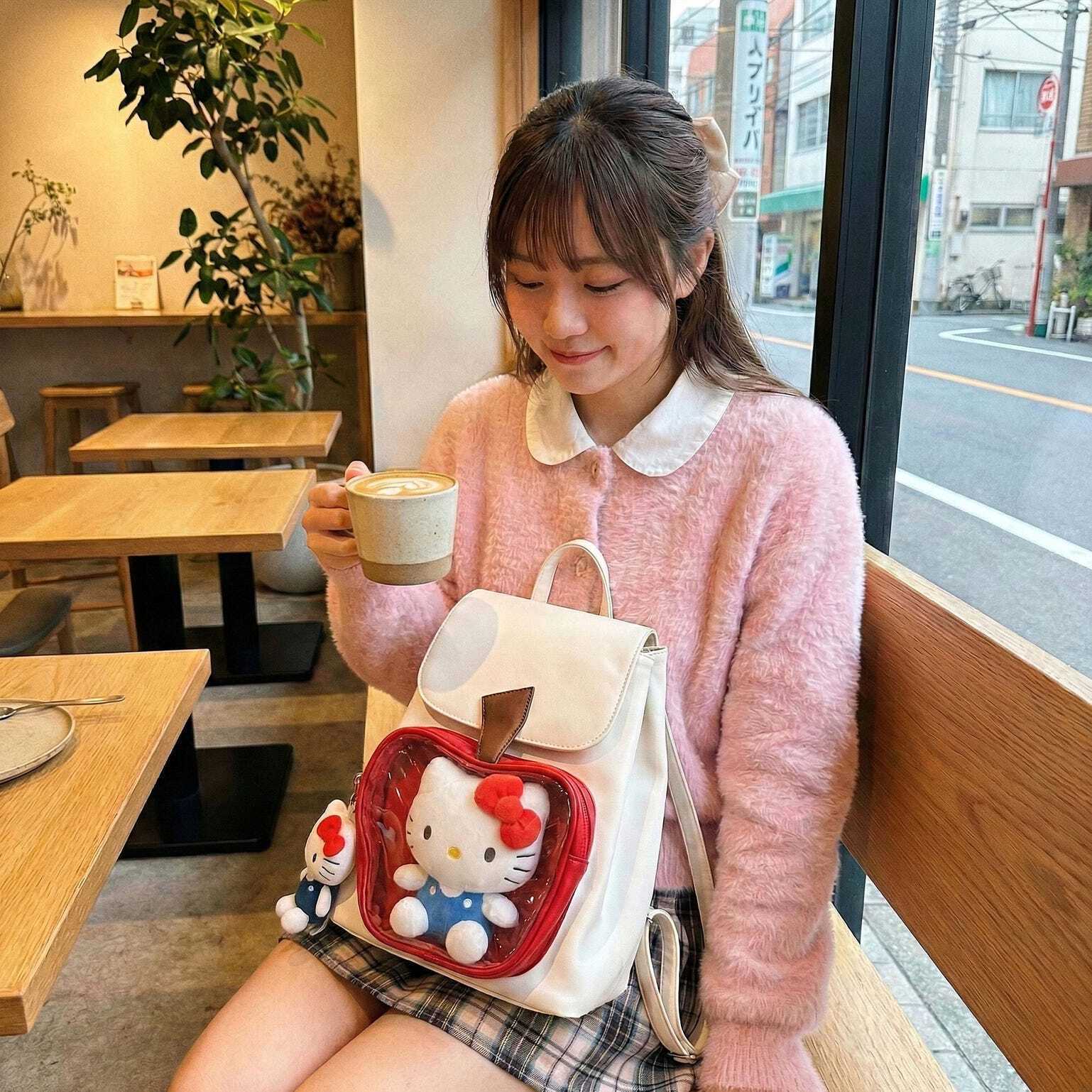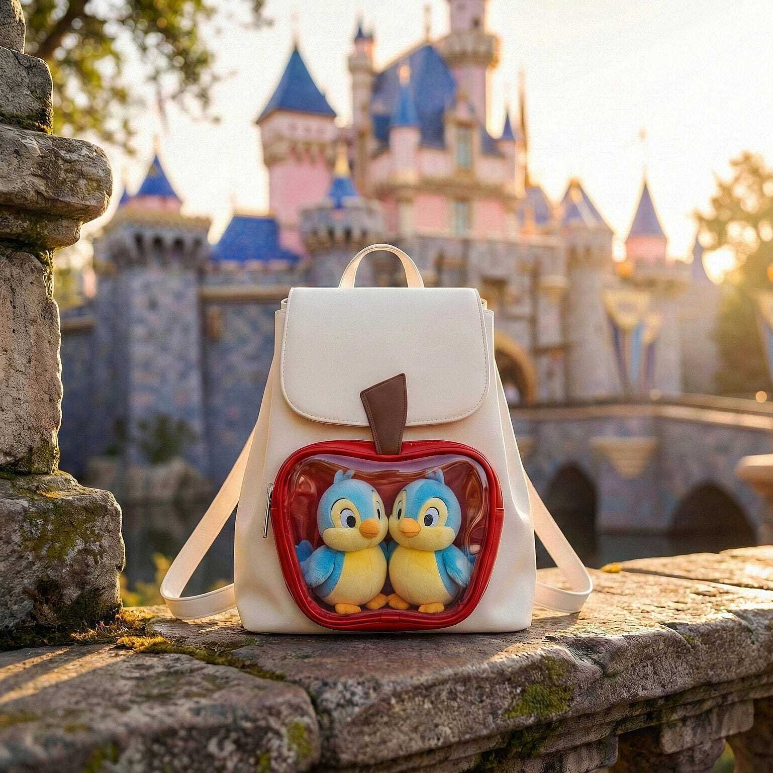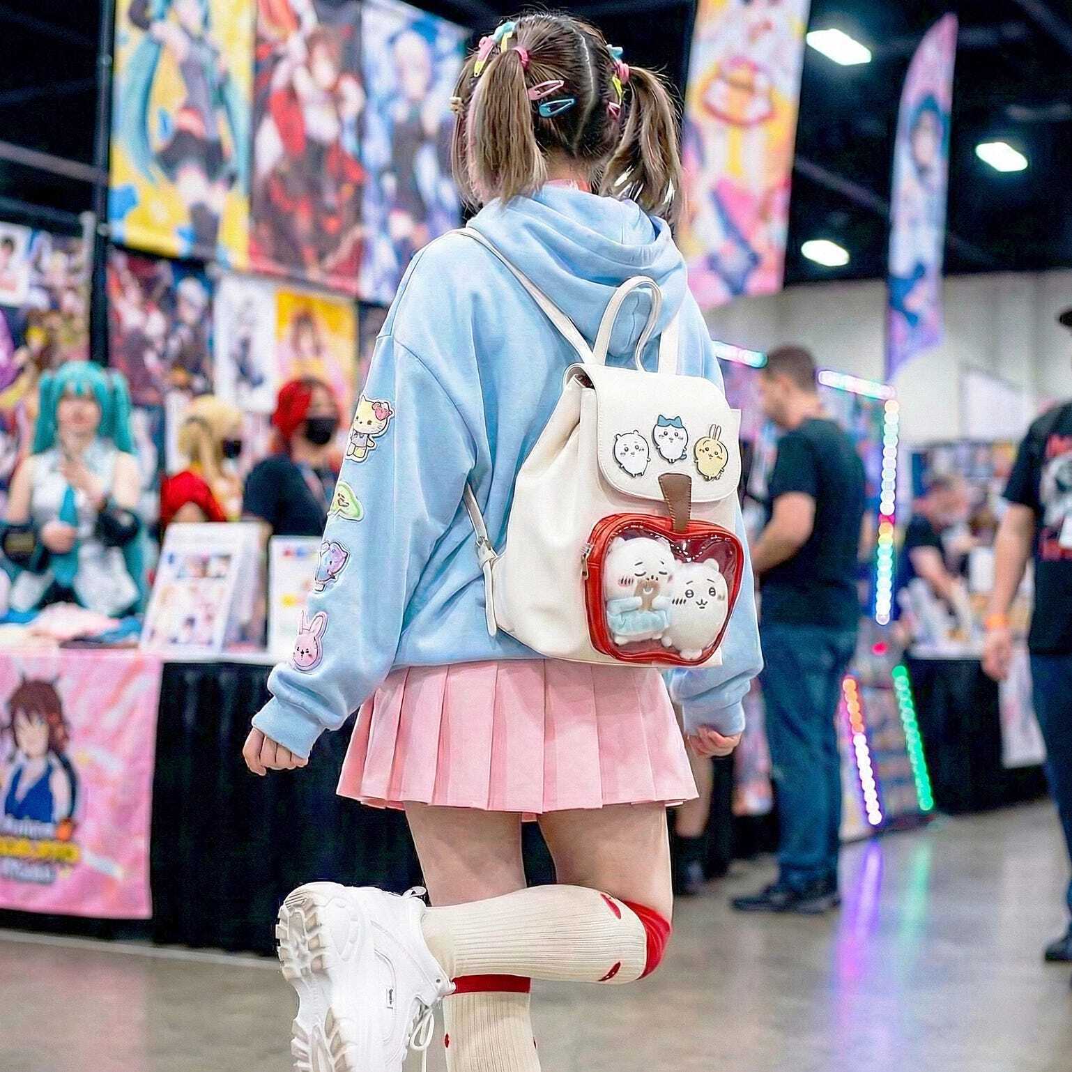 White Apple Ita Backpack with Clear Window for Plushies and Pins is designed to display plushies, dolls, pins, and badges while keeping everyday essentials organized.