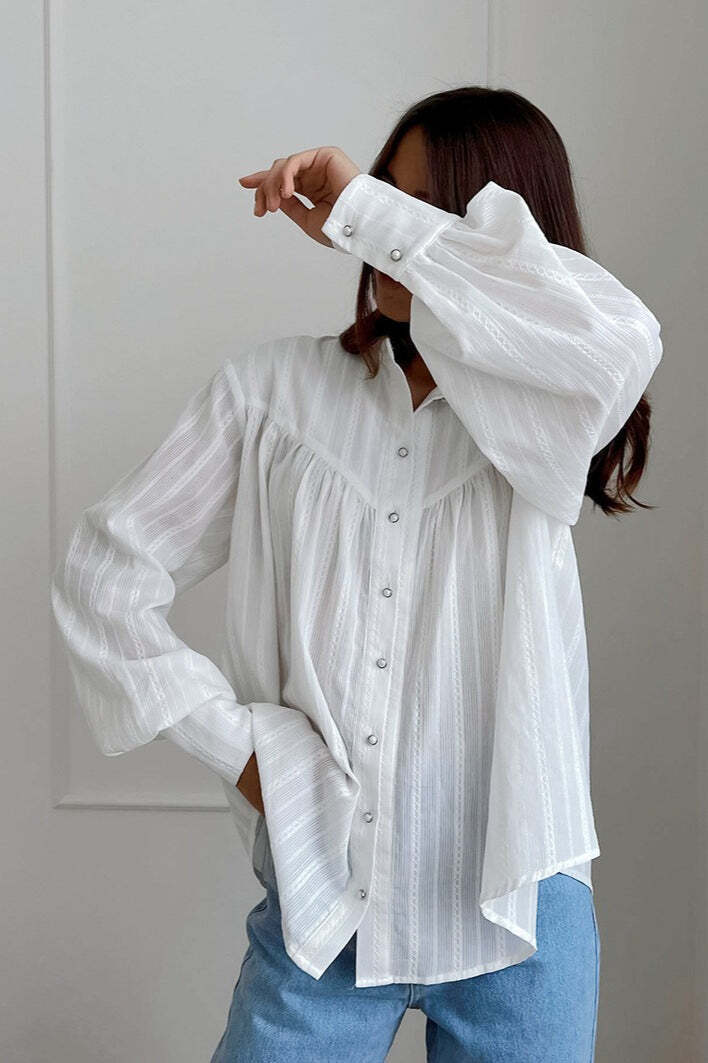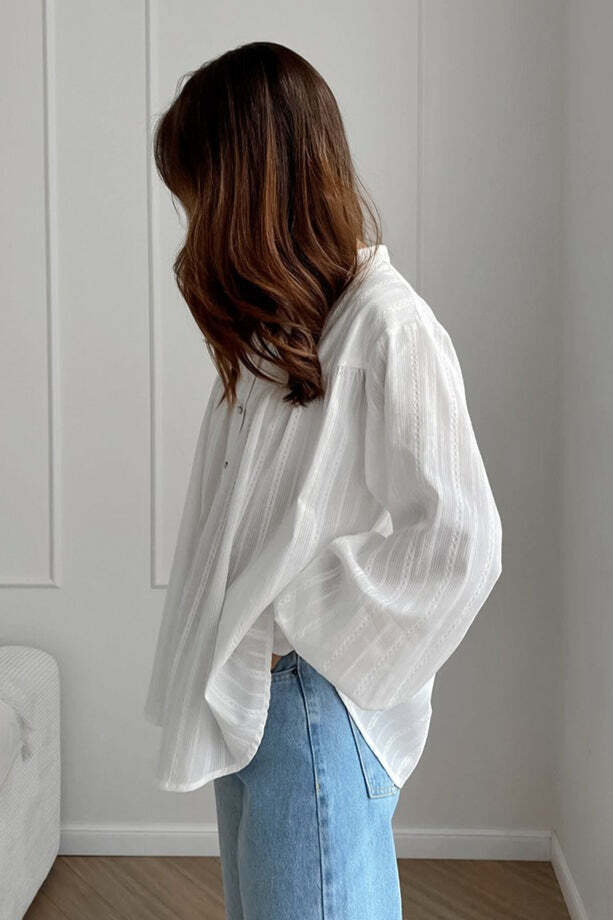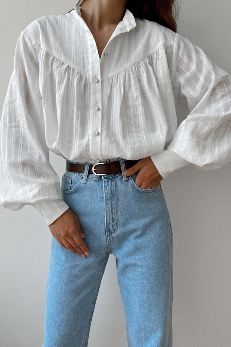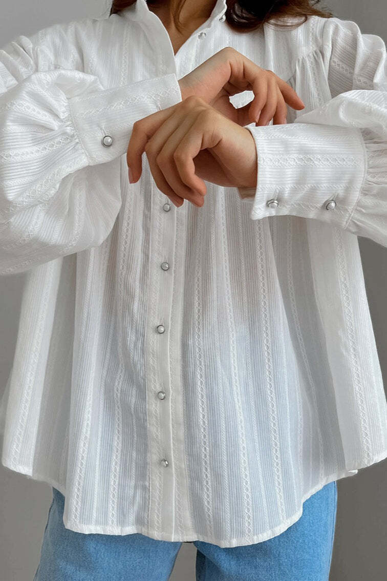 White Cotton Jacquard Stand Collar Blouse
