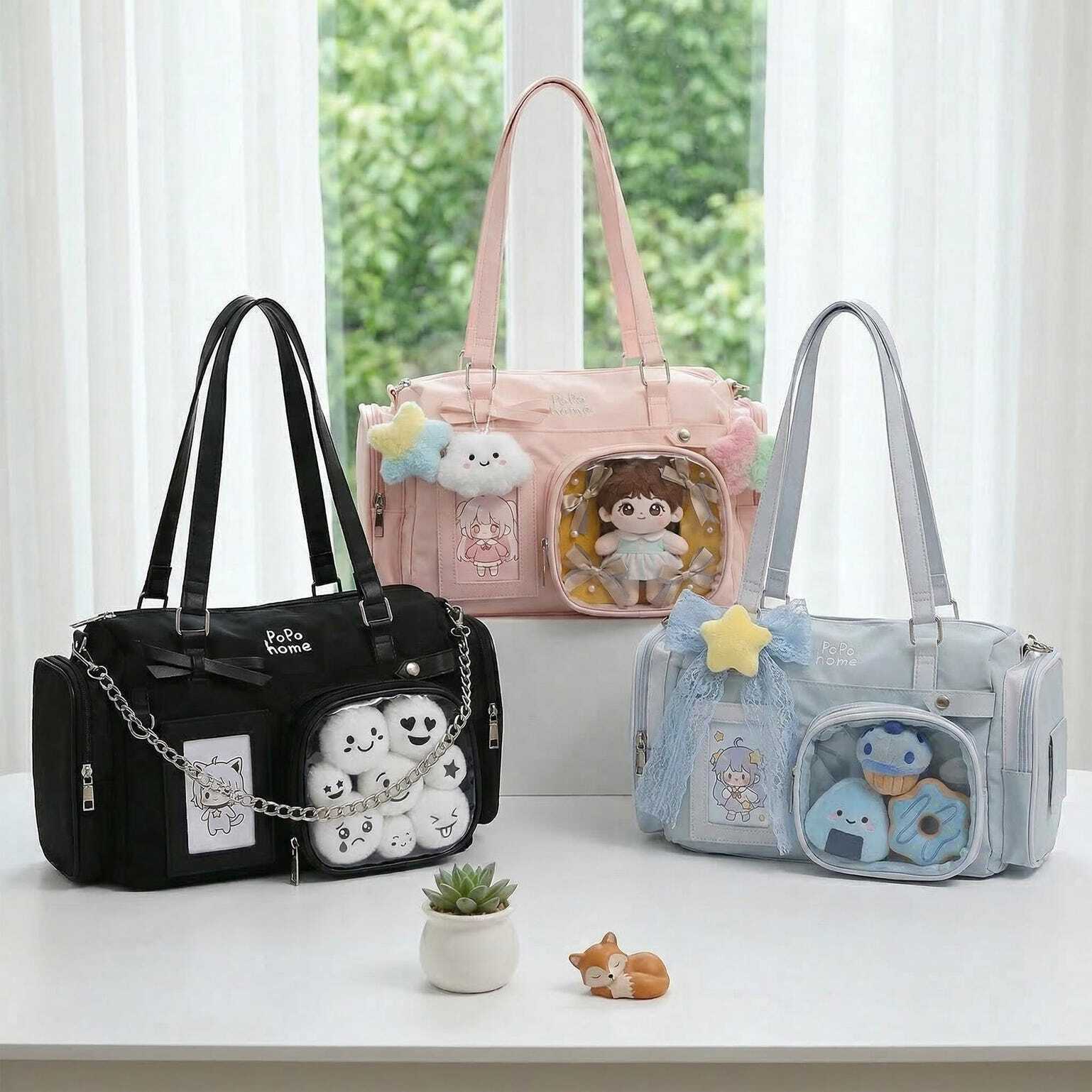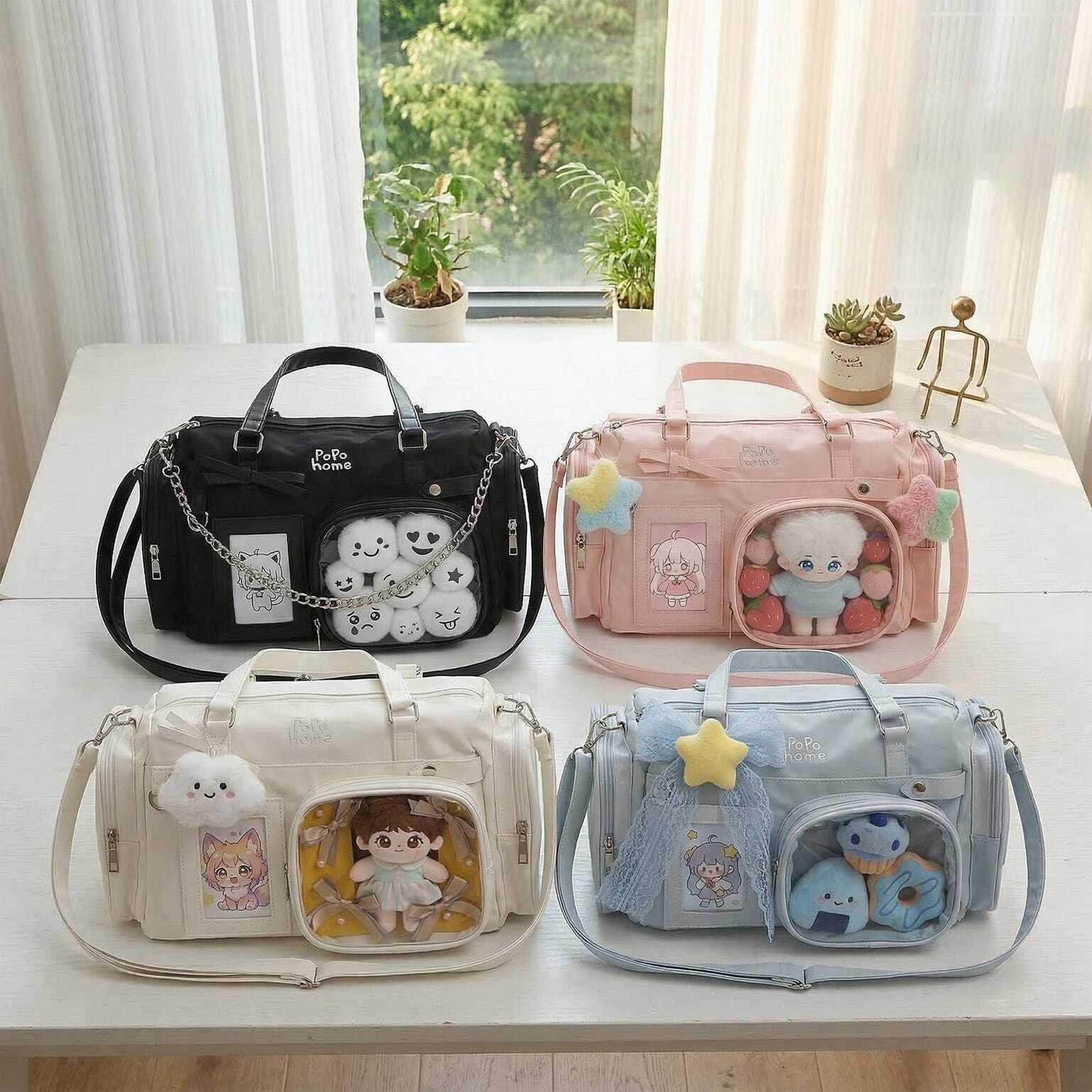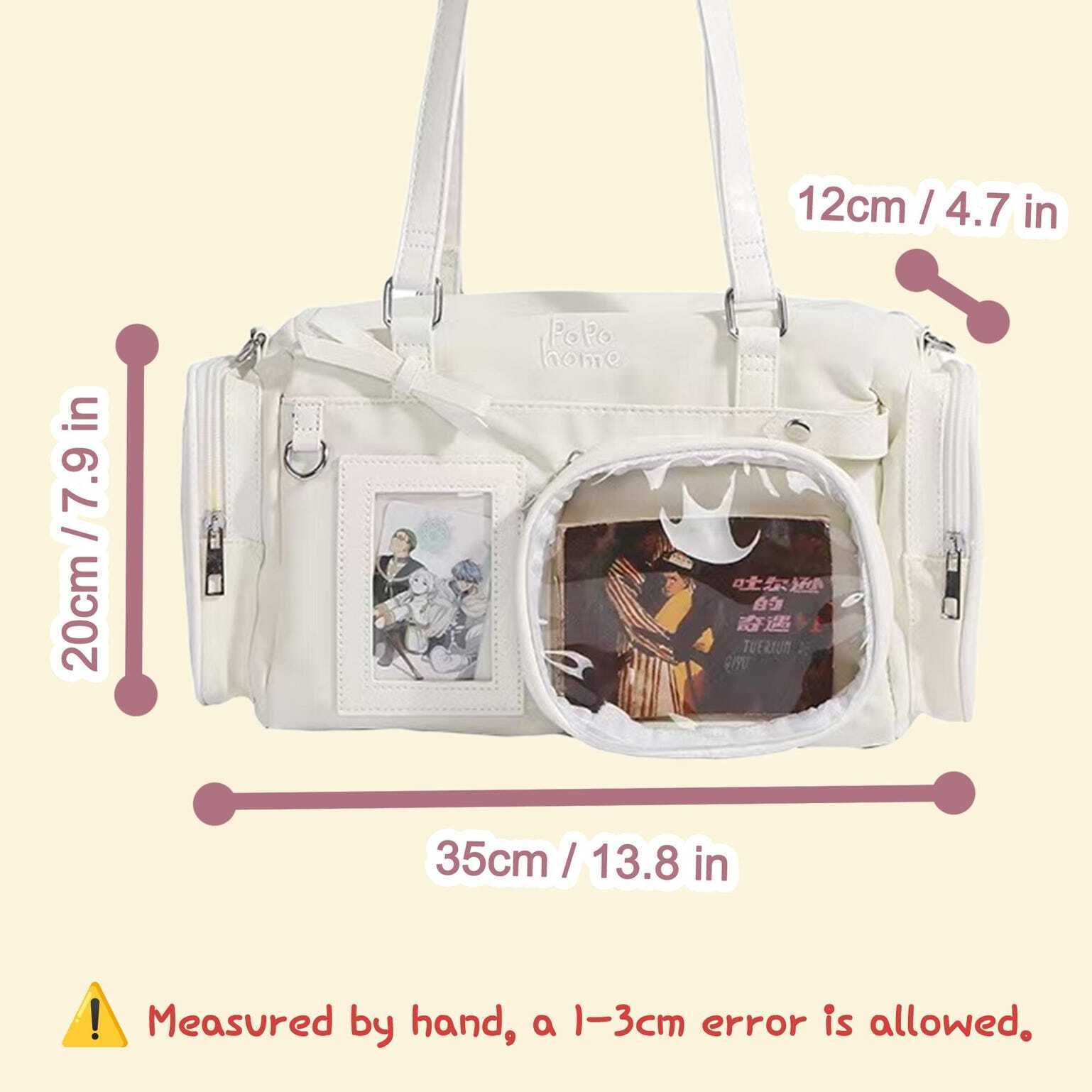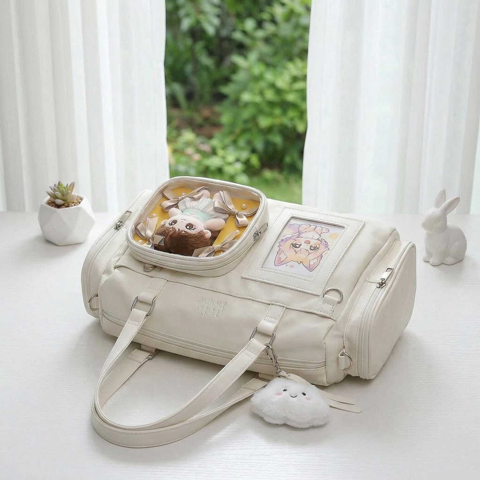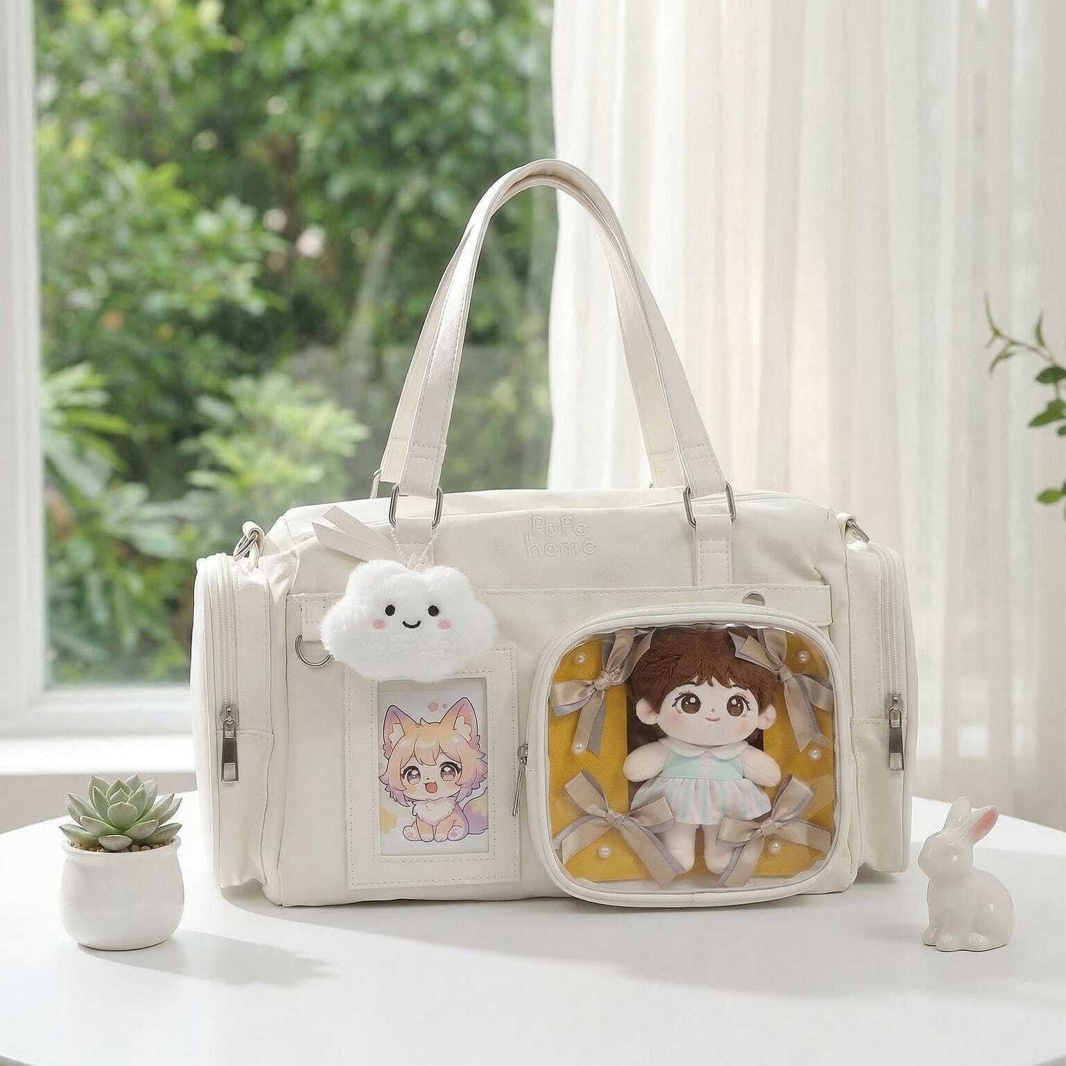 White Ita Crossbody Bag with Clear Window for Plushies and Pins is designed to display plushies, dolls, pins, and badges while keeping everyday essentials organized.