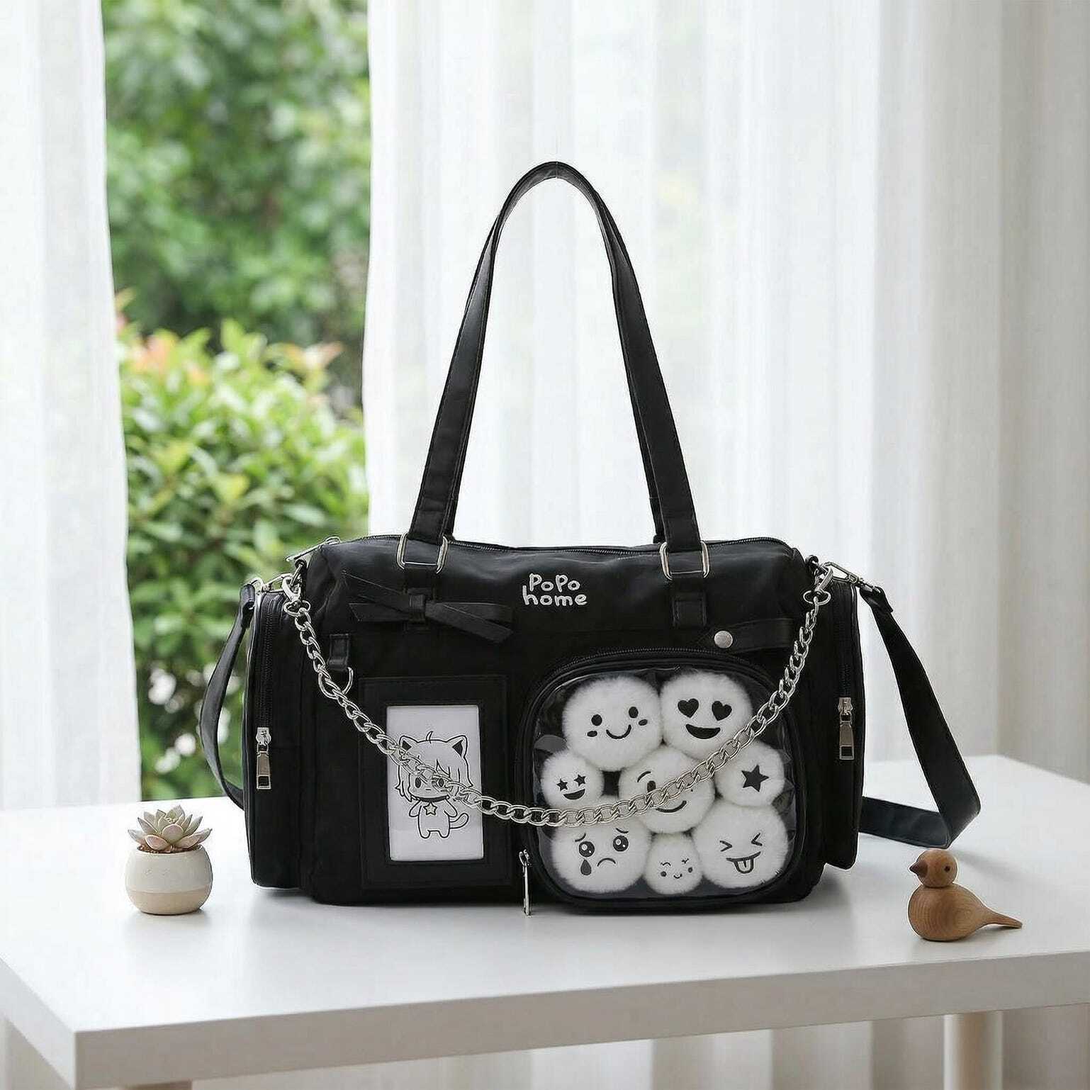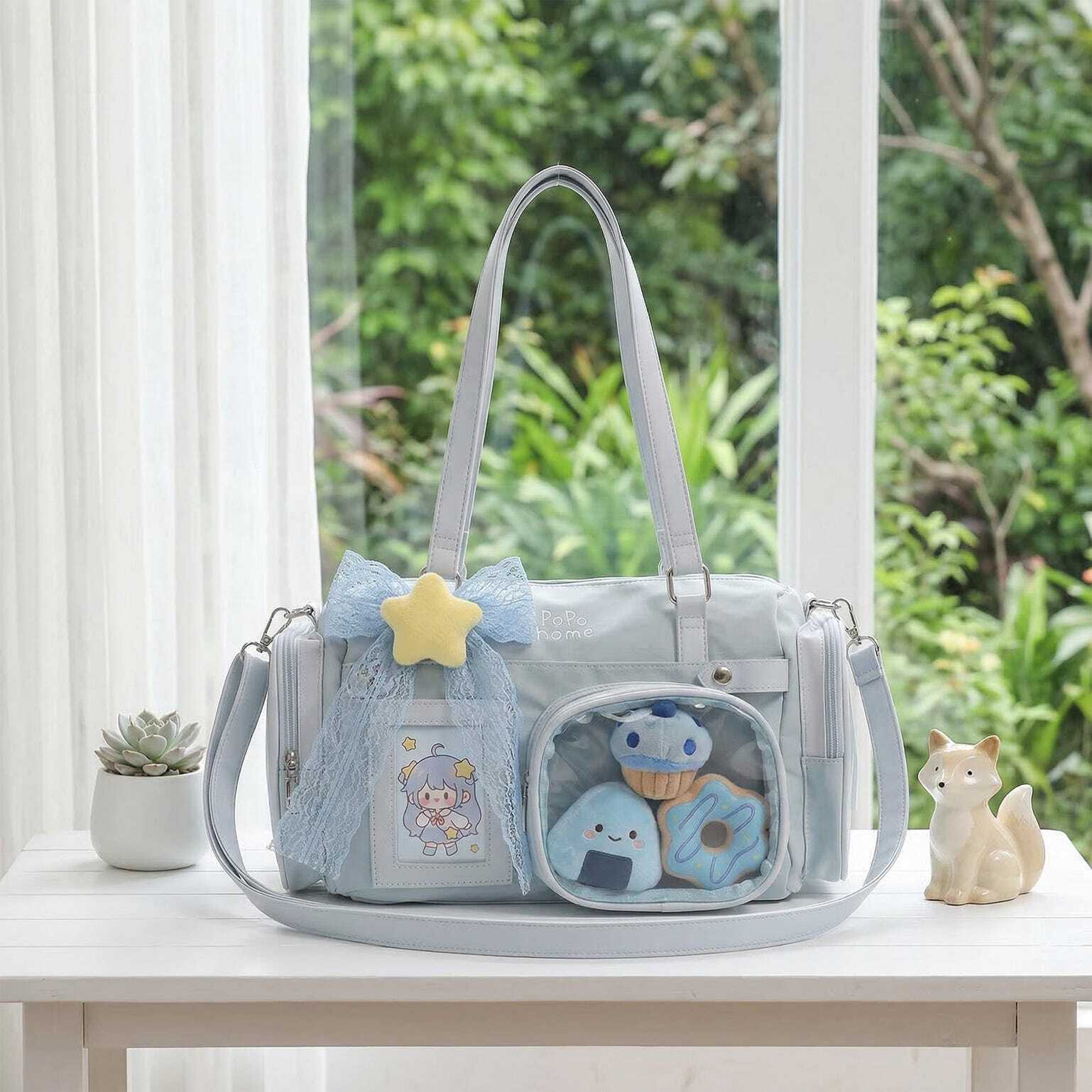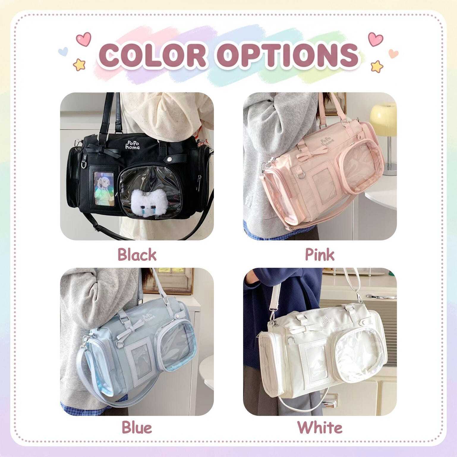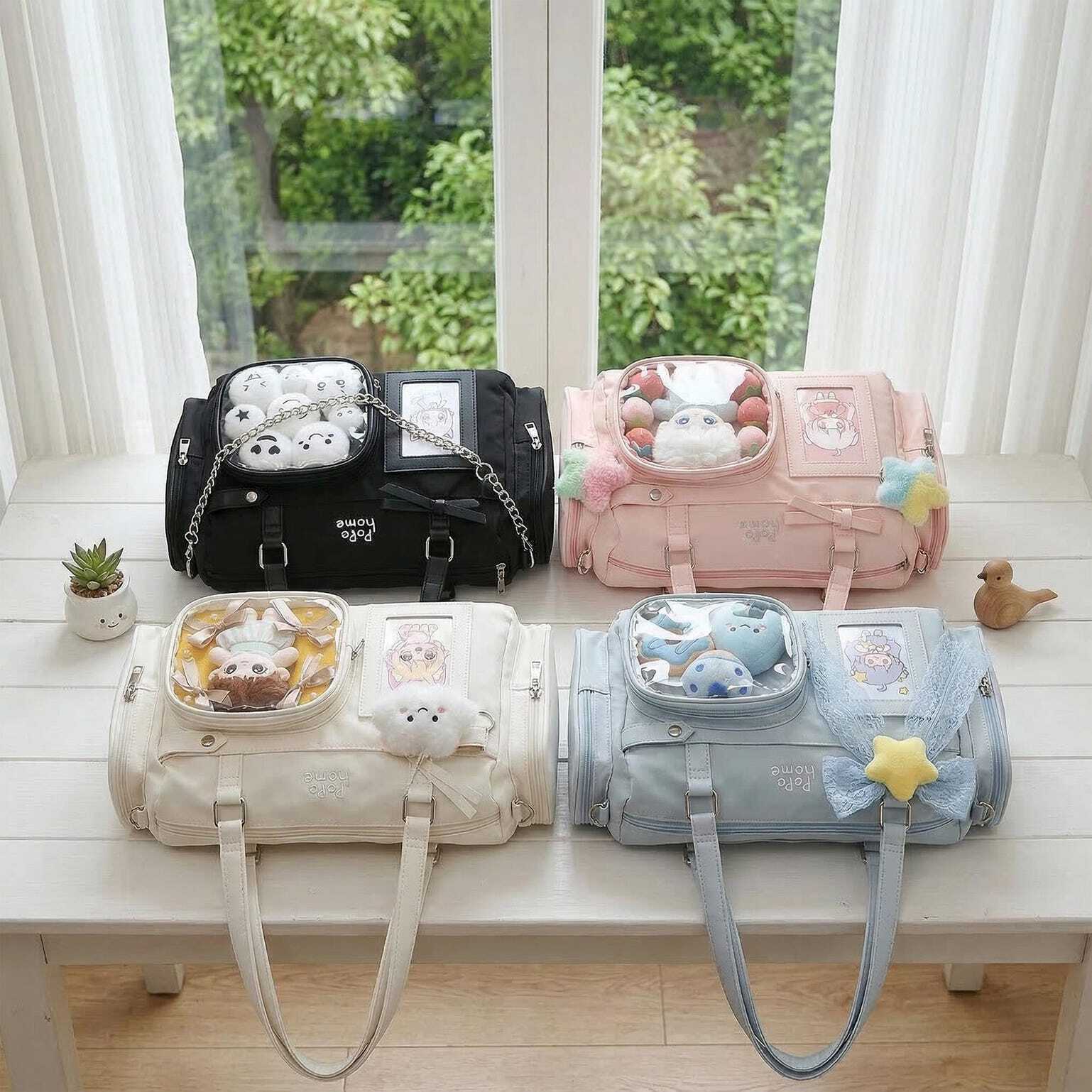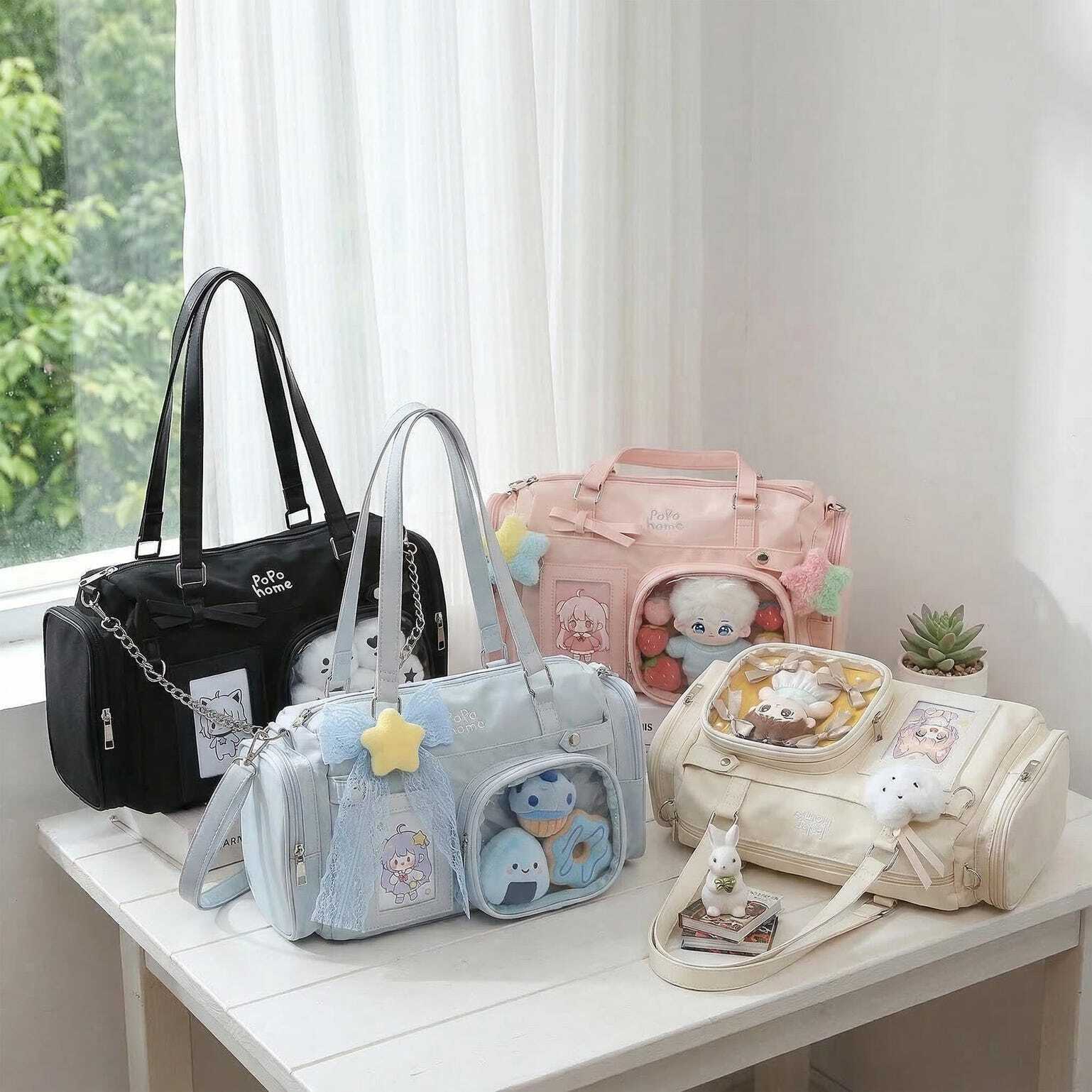 White Ita Crossbody Bag with Clear Window for Plushies and Pins is designed to display plushies, dolls, pins, and badges while keeping everyday essentials organized.