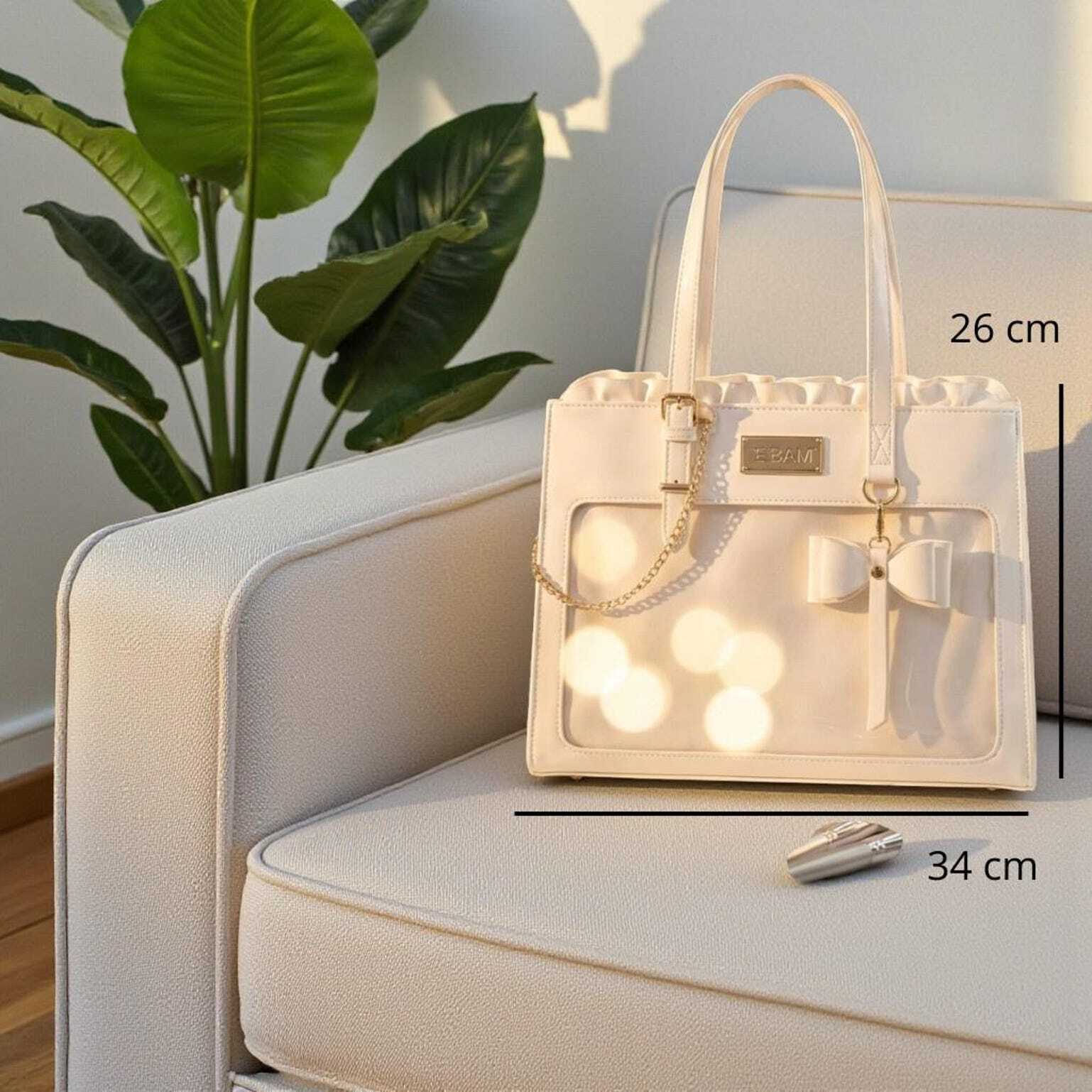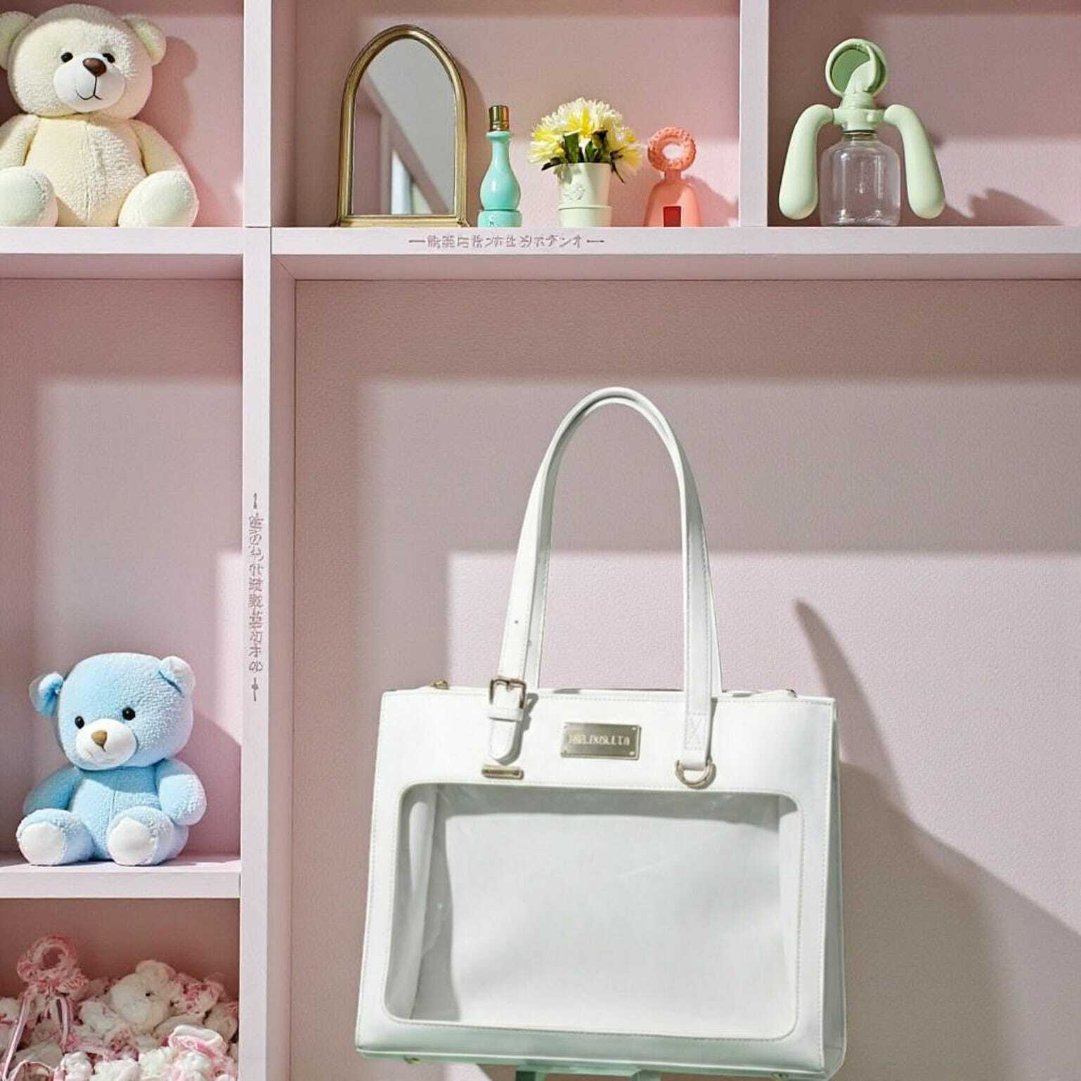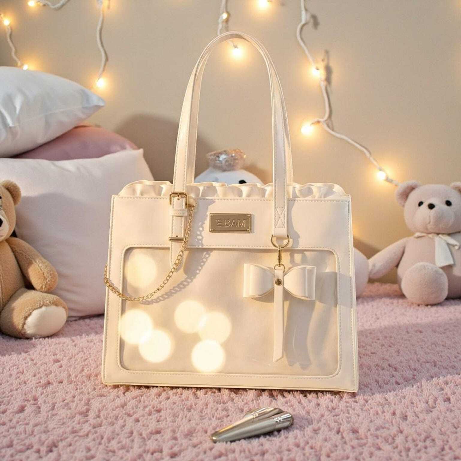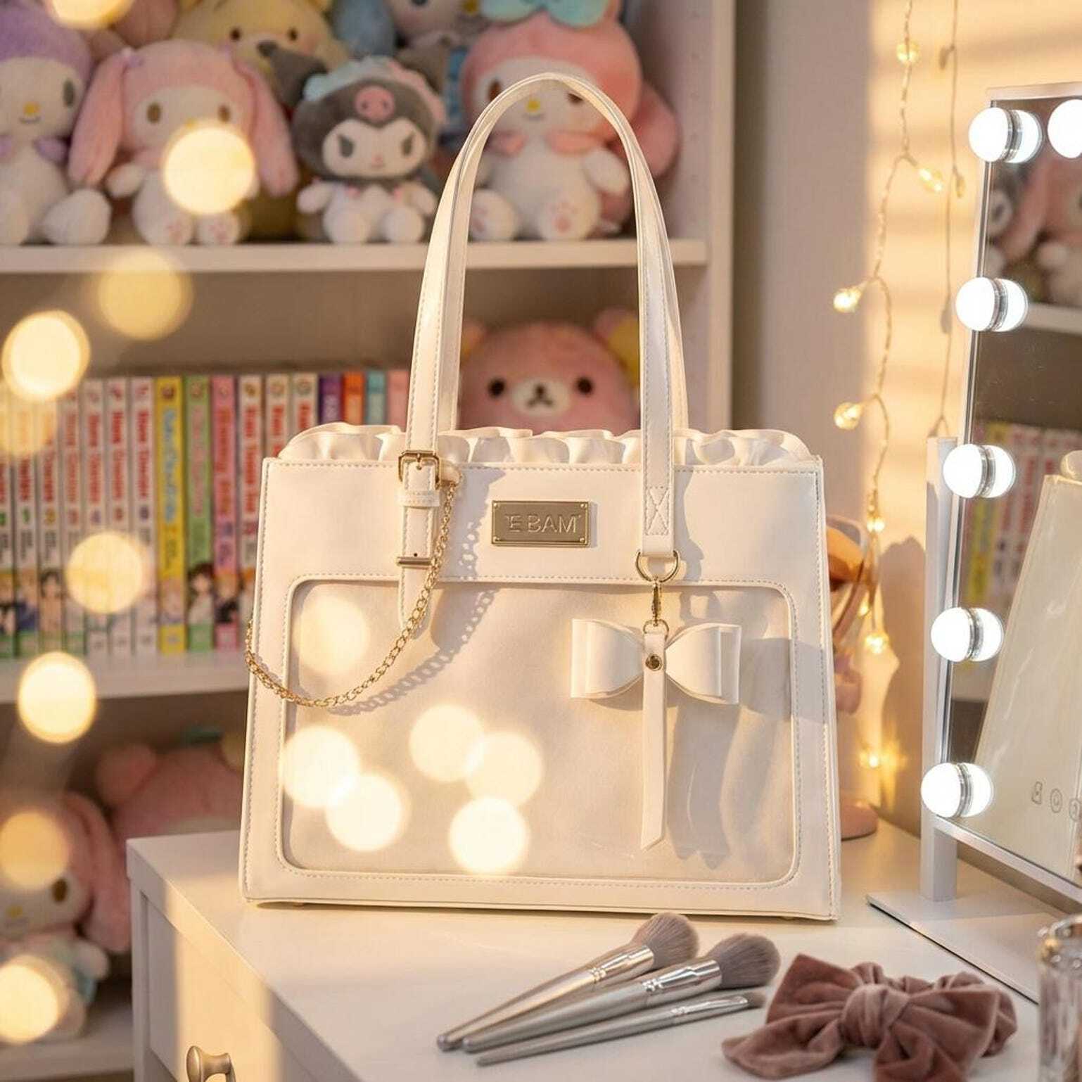 White Kawaii Convertible Ita Bag with Clear Window for Pin Display combines everyday carry with a clear display area for pins, badges, charms, or character merch.