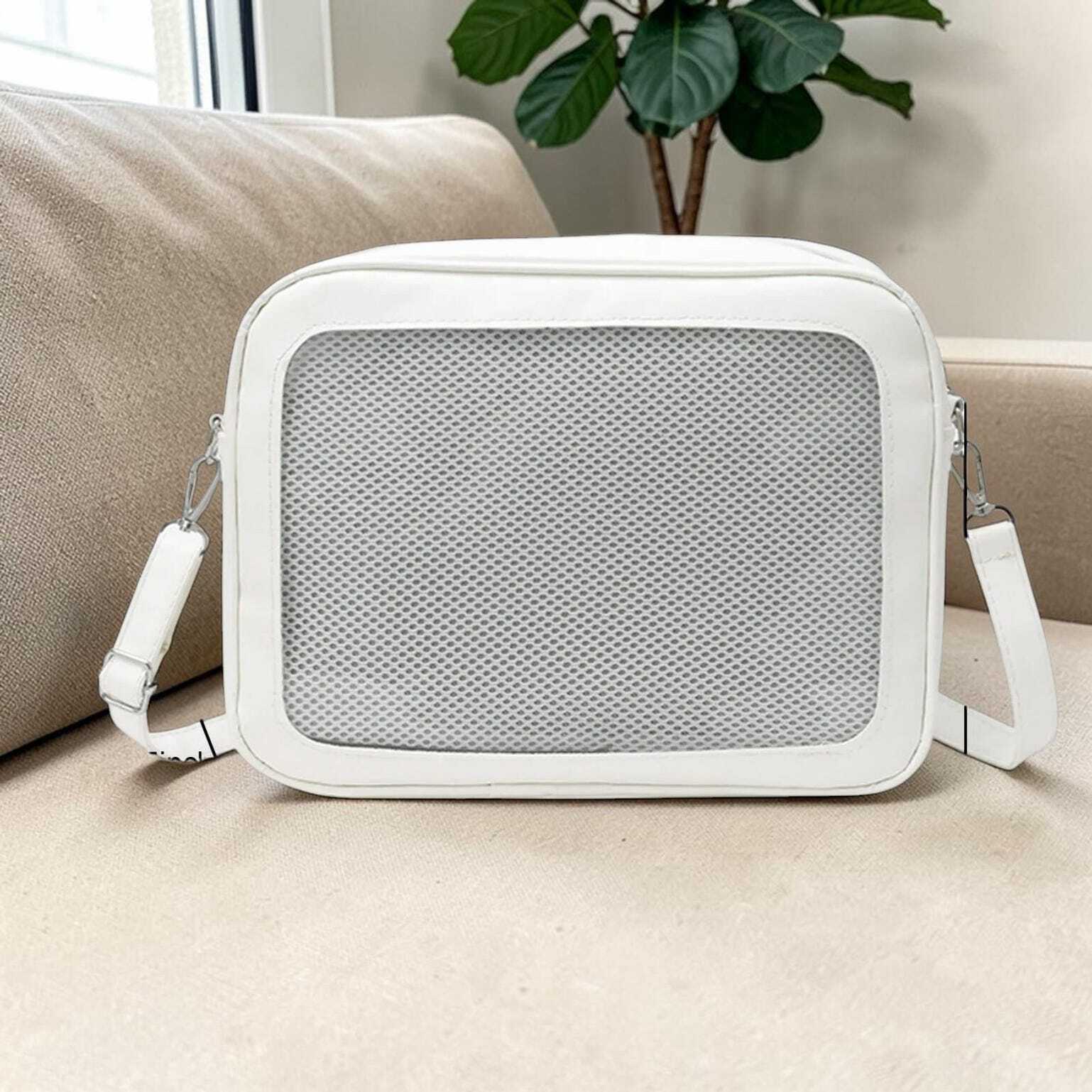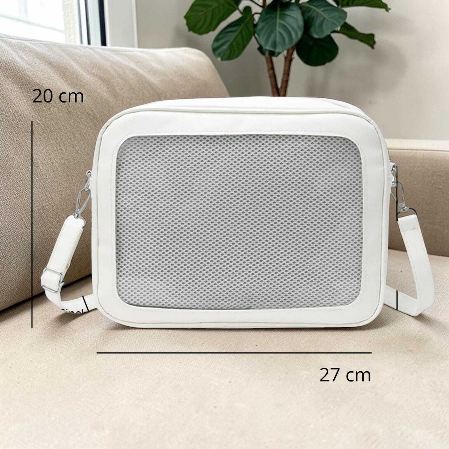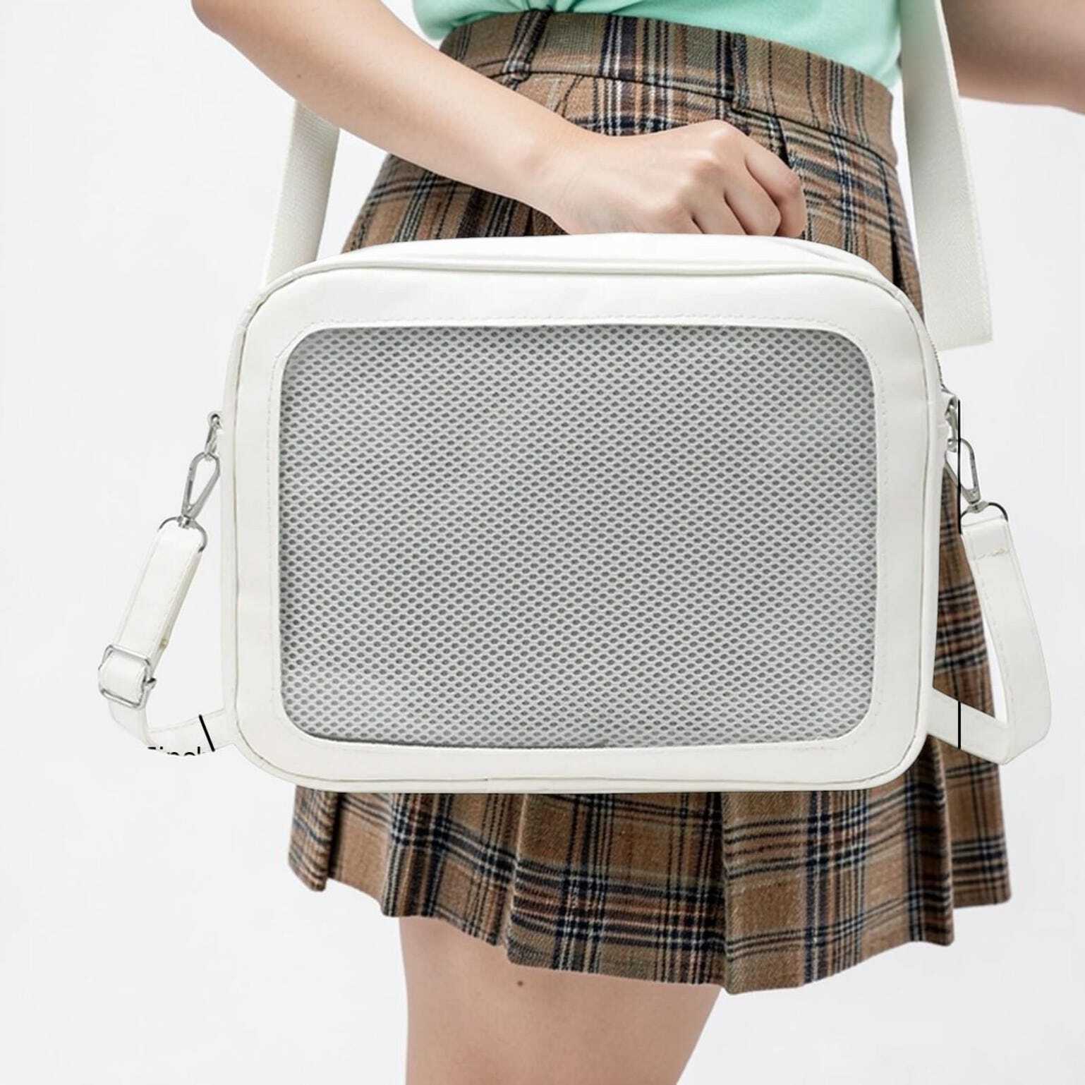 White Kawaii Convertible Ita Bag with Clear Window for Pin Display combines everyday carry with a clear display area for pins, badges, charms, or character merch.