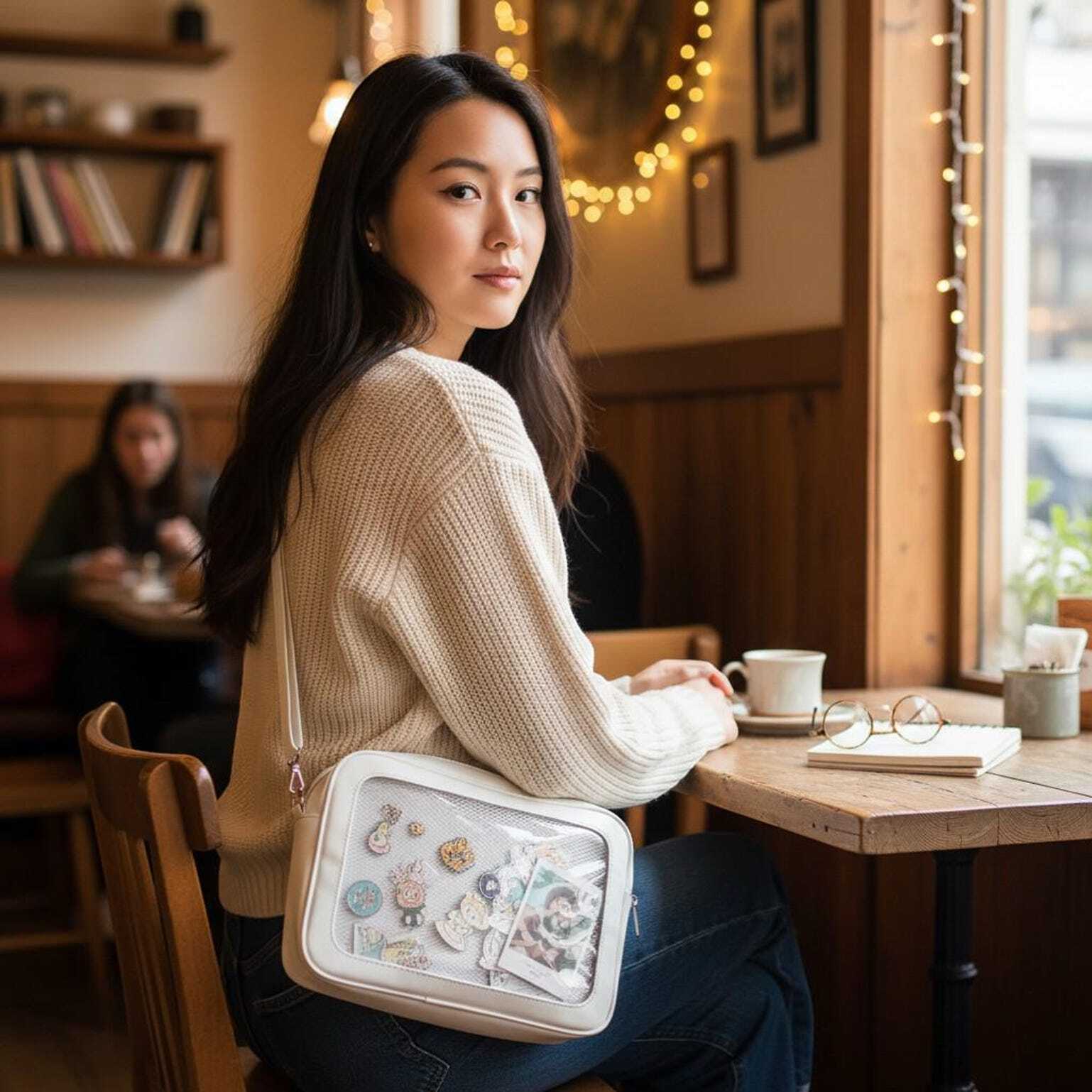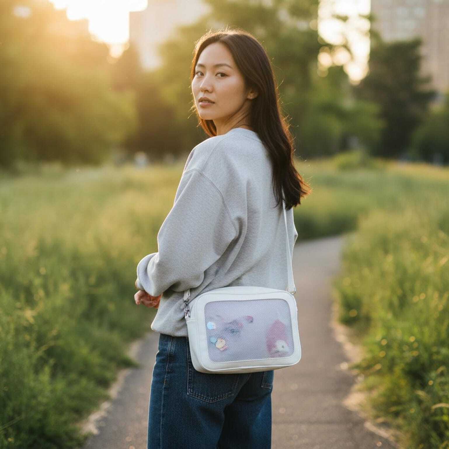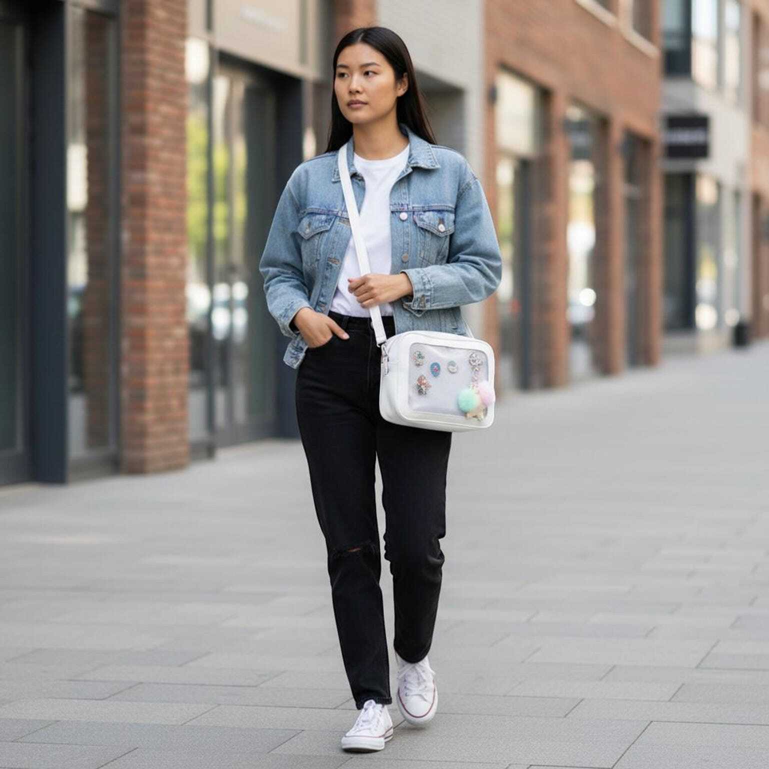 White Kawaii Convertible Ita Bag with Clear Window for Pin Display combines everyday carry with a clear display area for pins, badges, charms, or character merch.