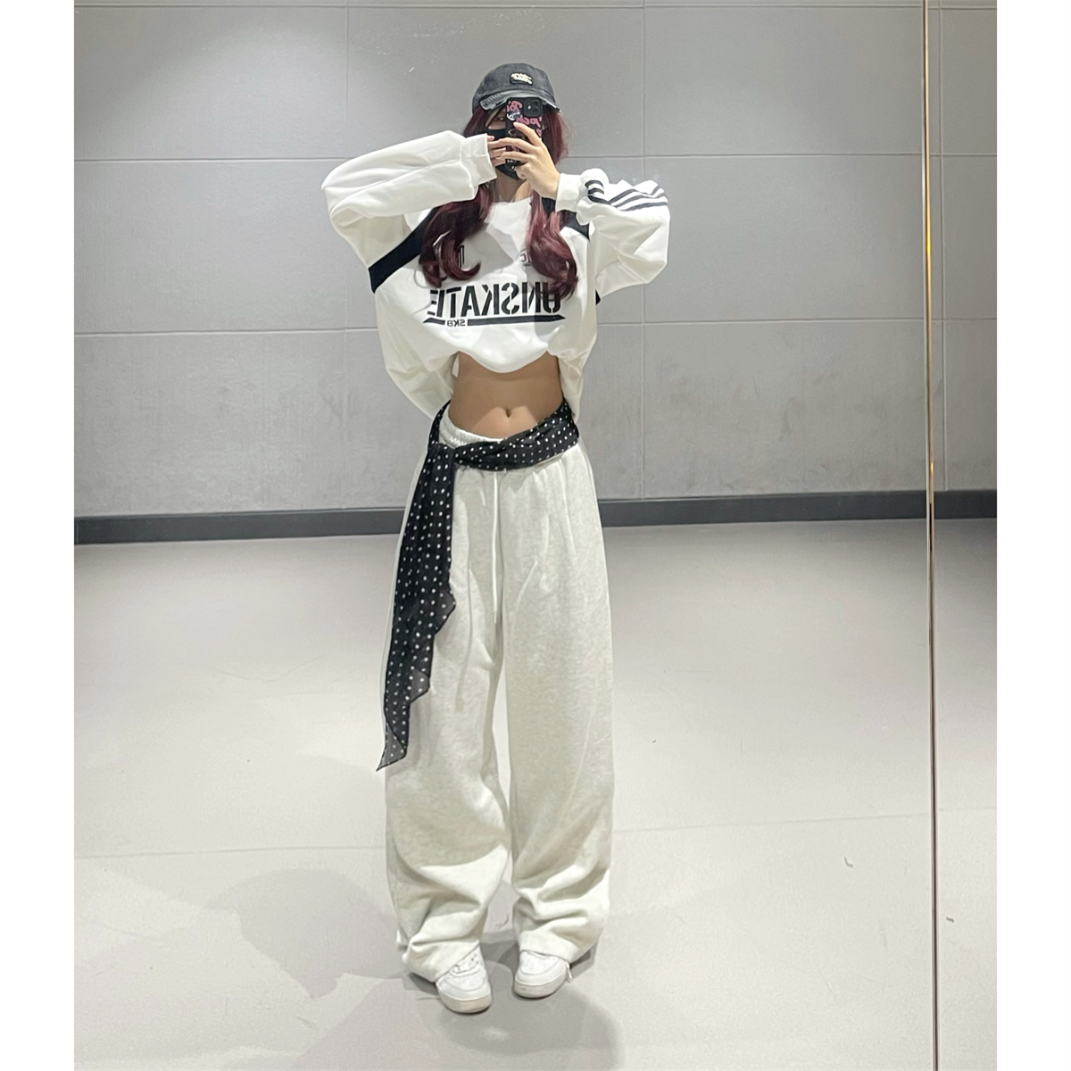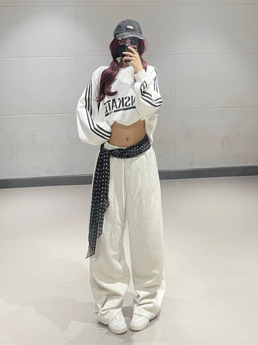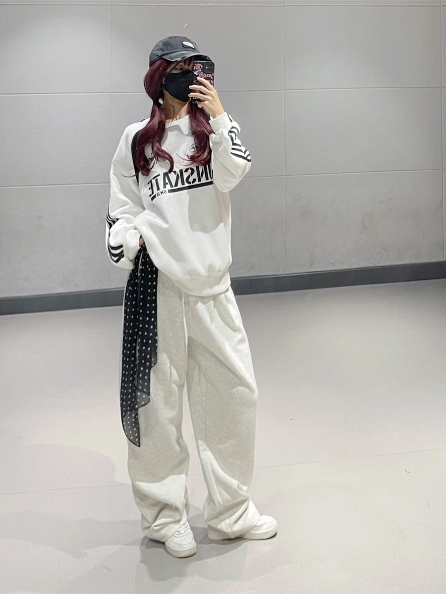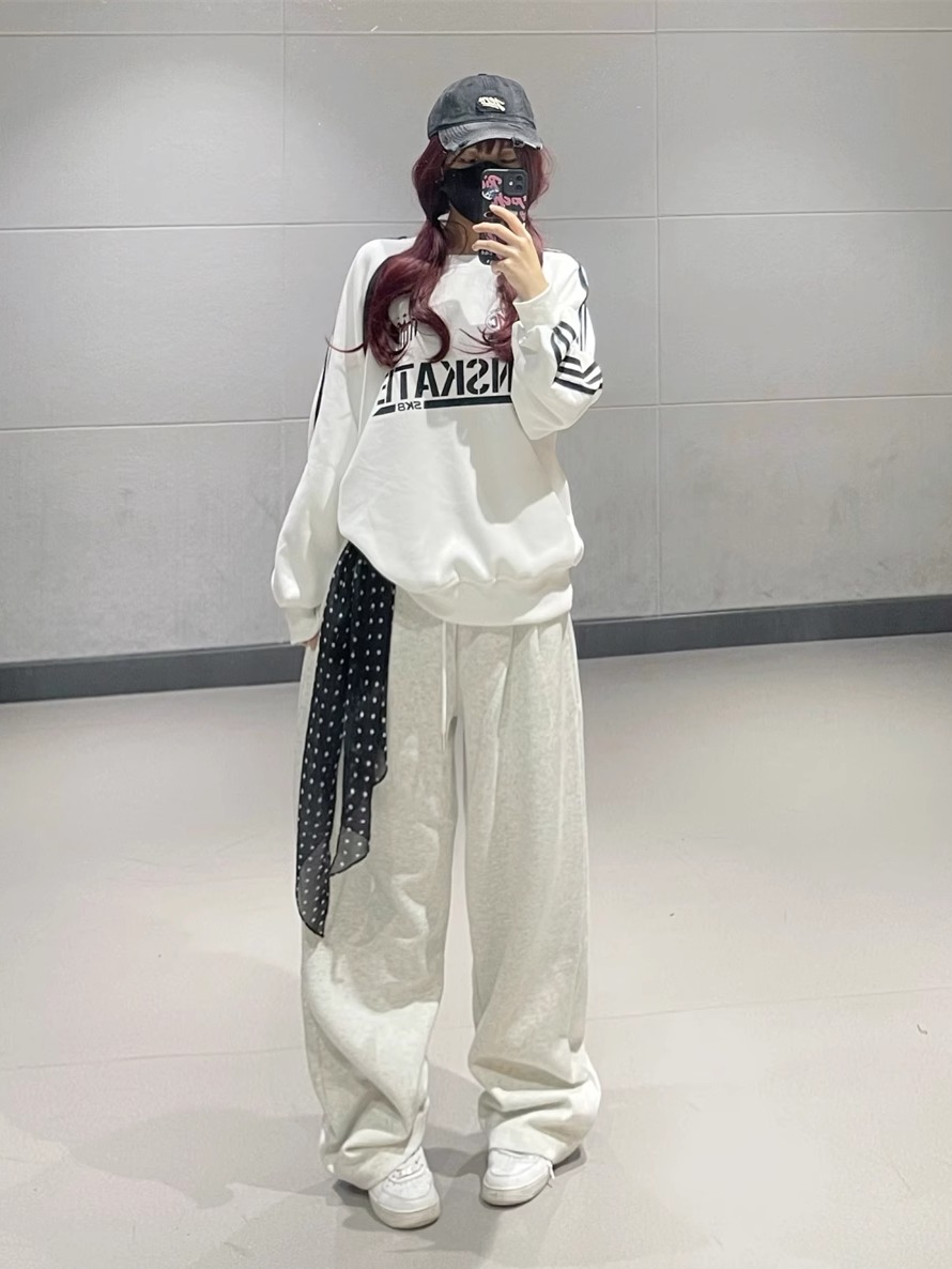 | Color | Black printed sweatshirt, Polka dot waist tie, White gray sweatpants, White printed sweatshirt, White sweatshirt |