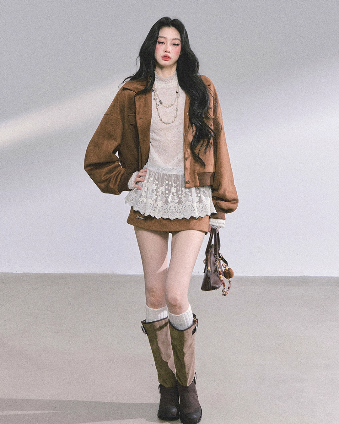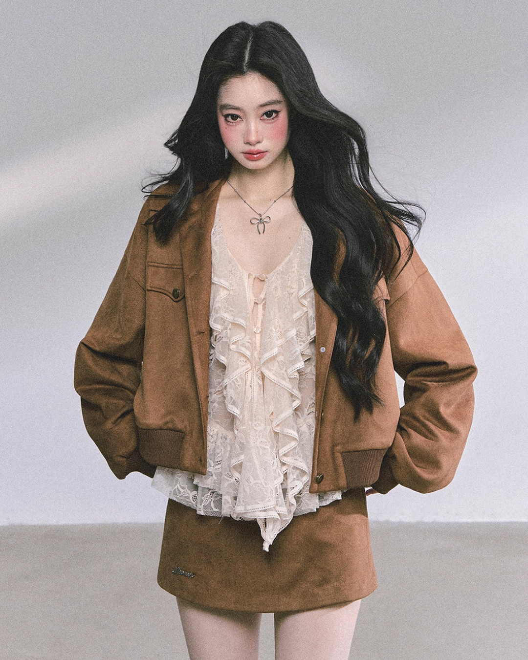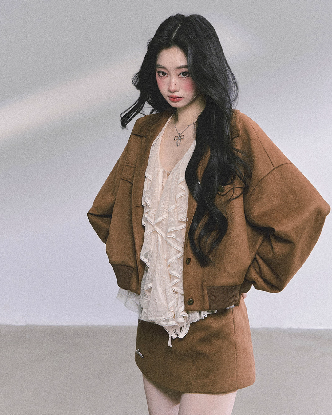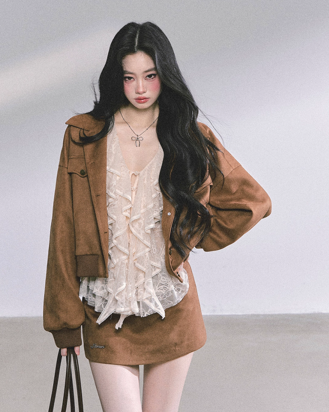 An attractive 3-piece set combining a blouse, jacket, and skirt.
