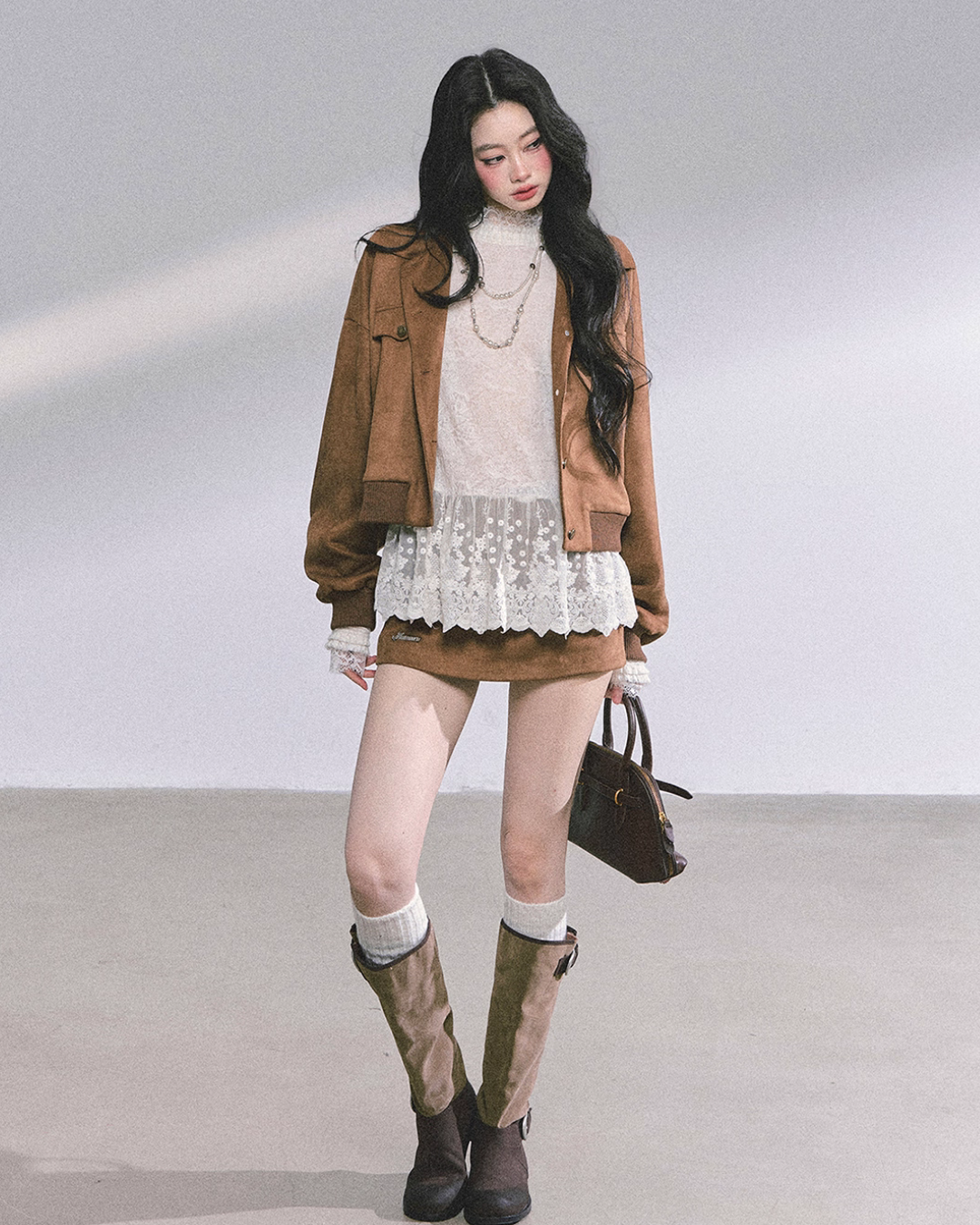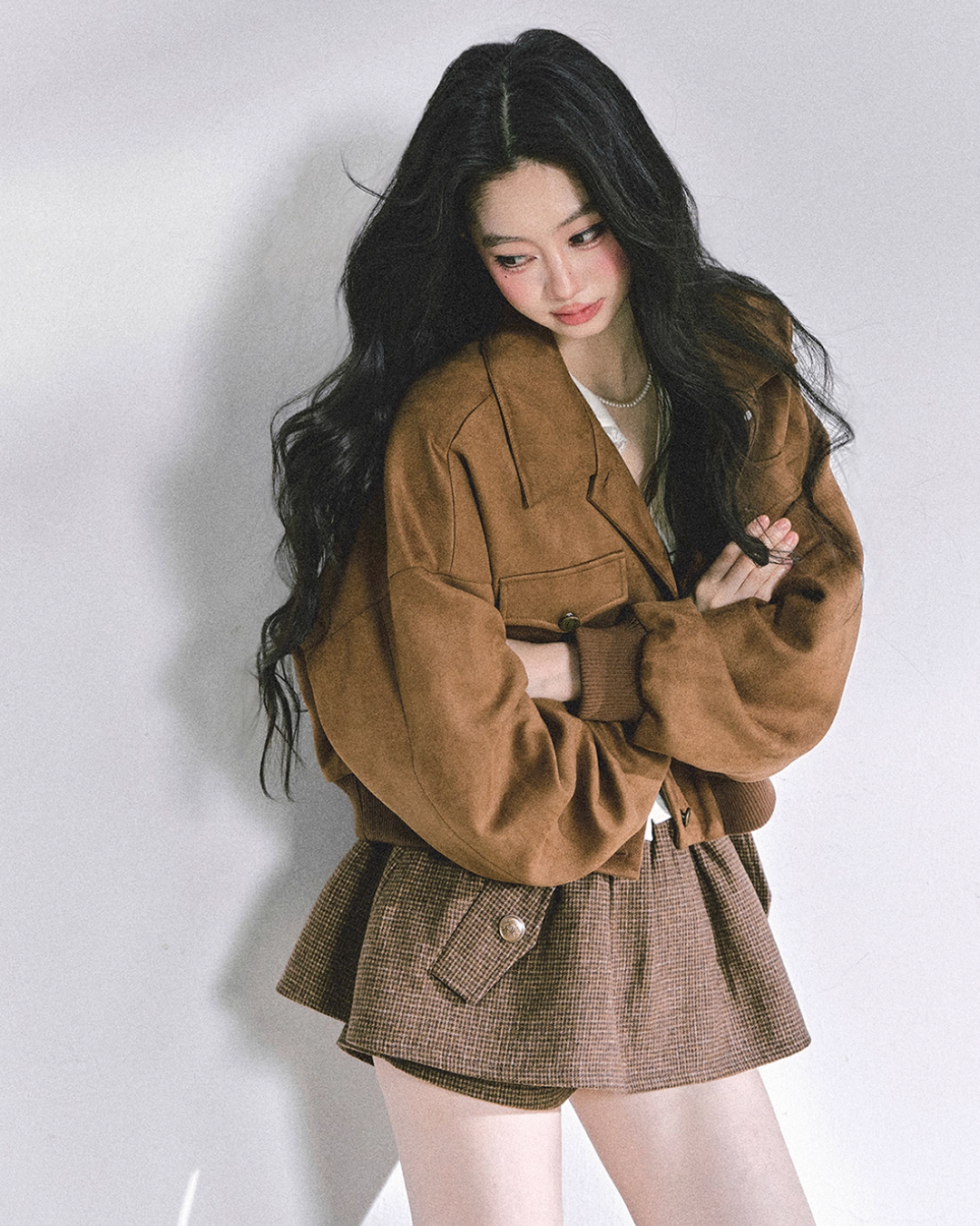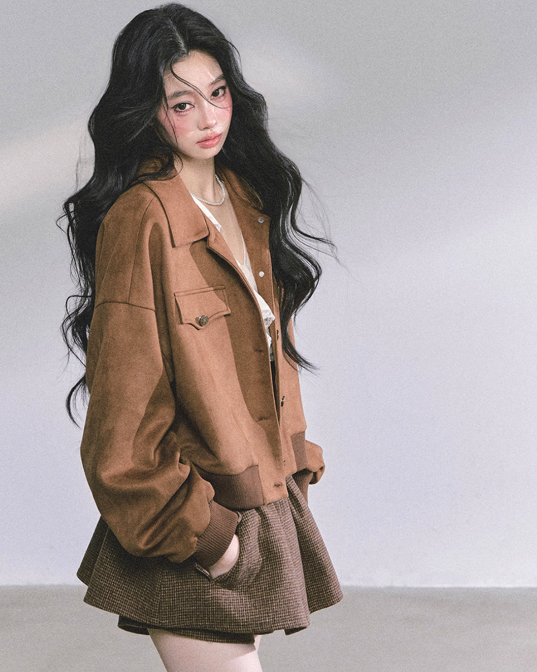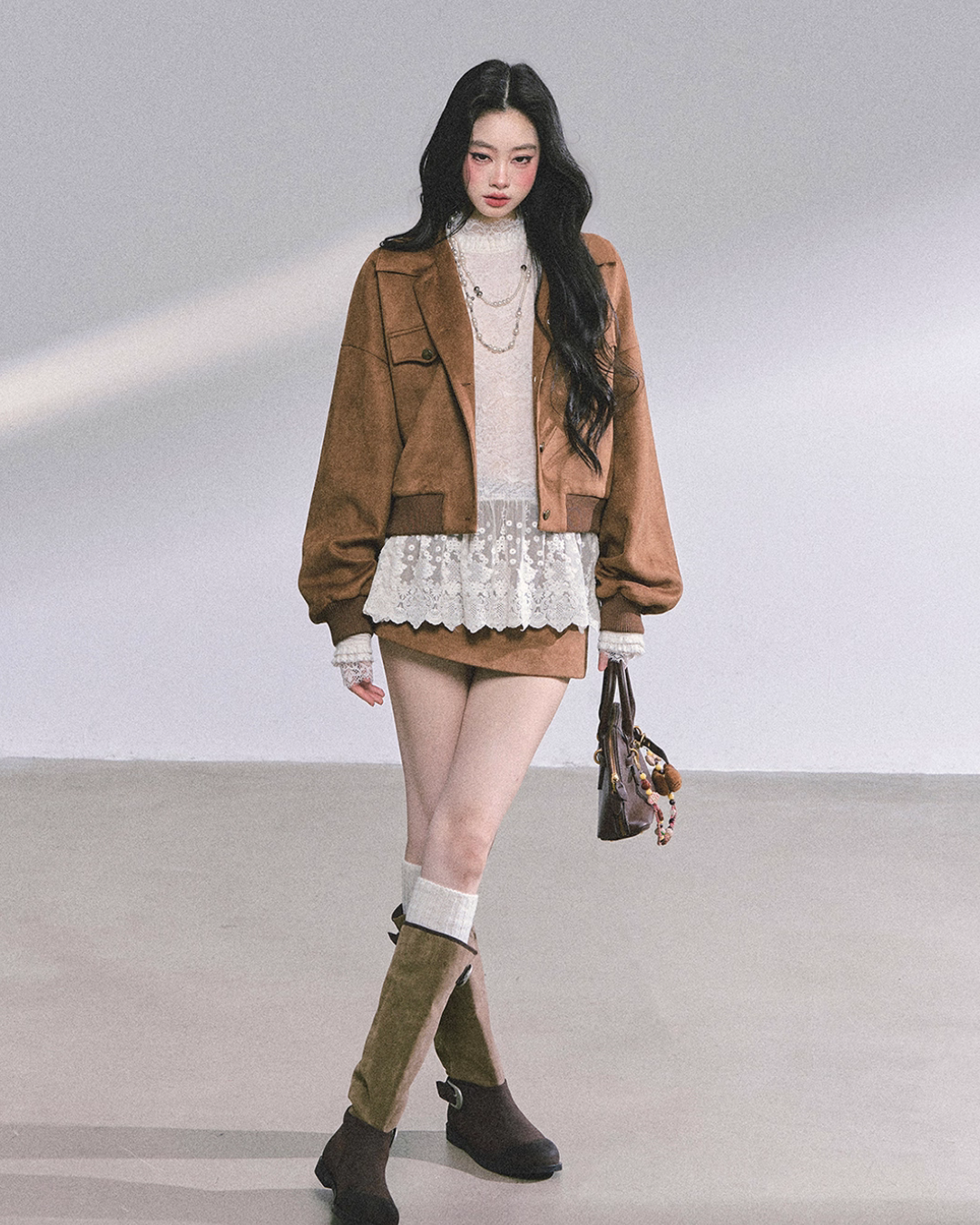 An attractive 3-piece set combining a blouse, jacket, and skirt.