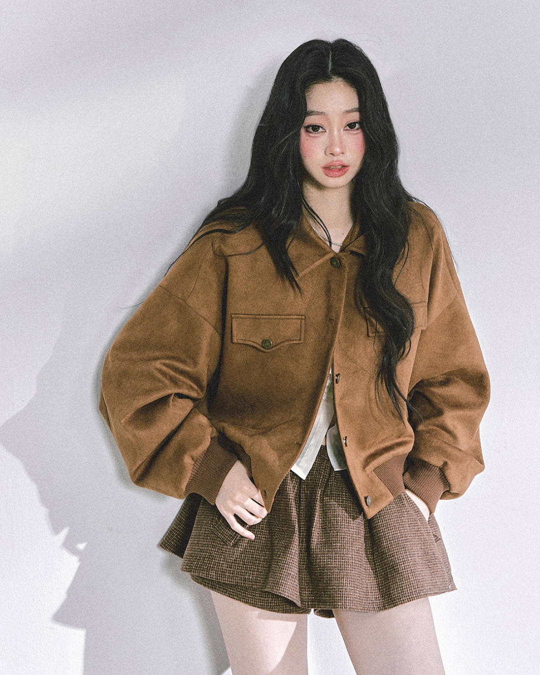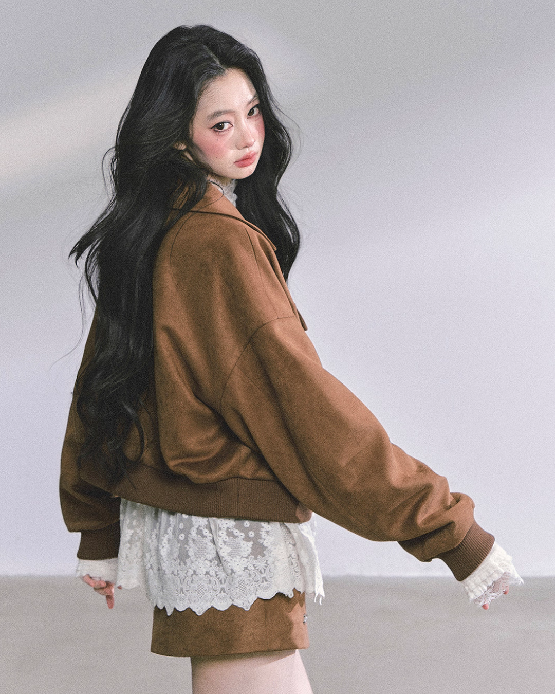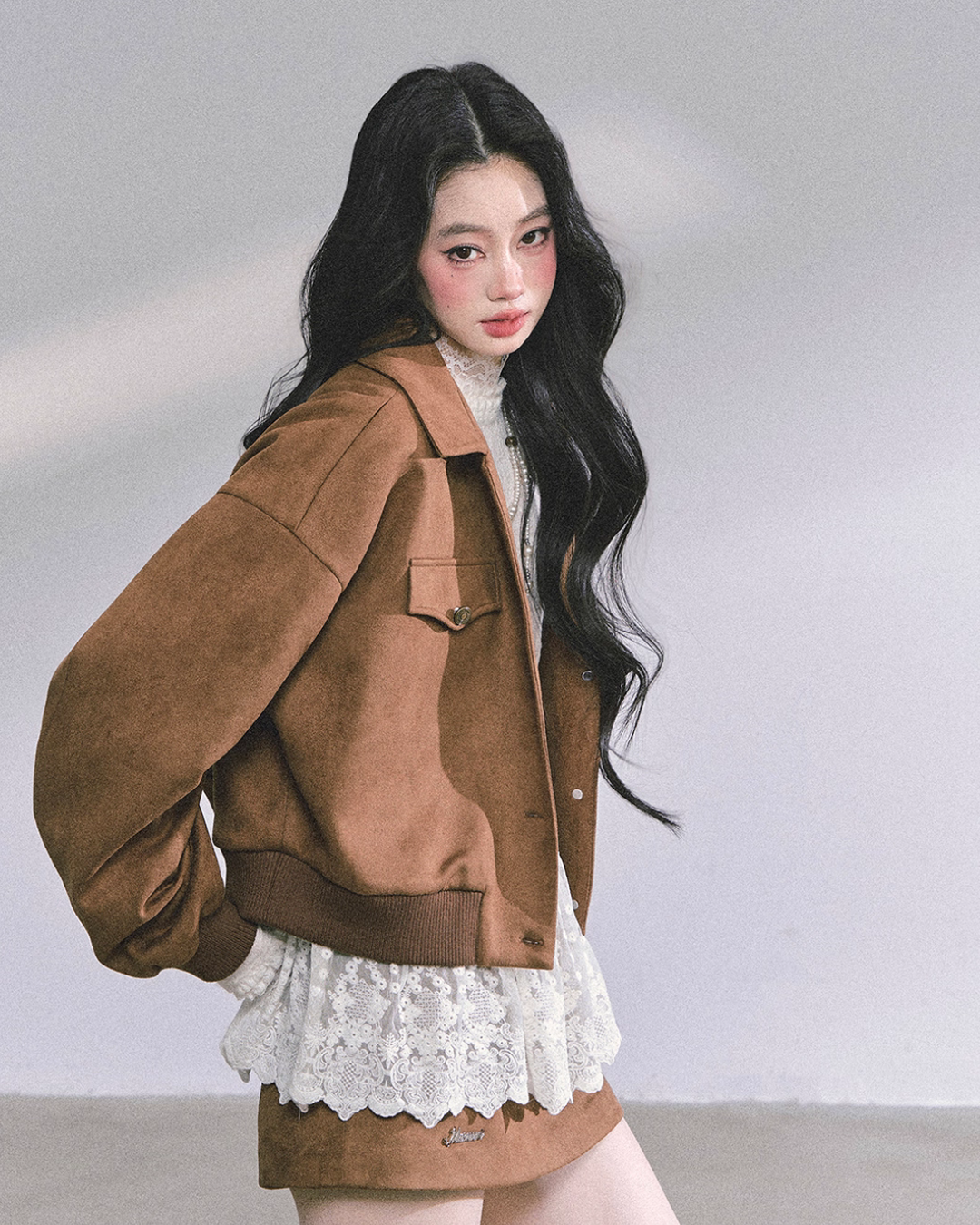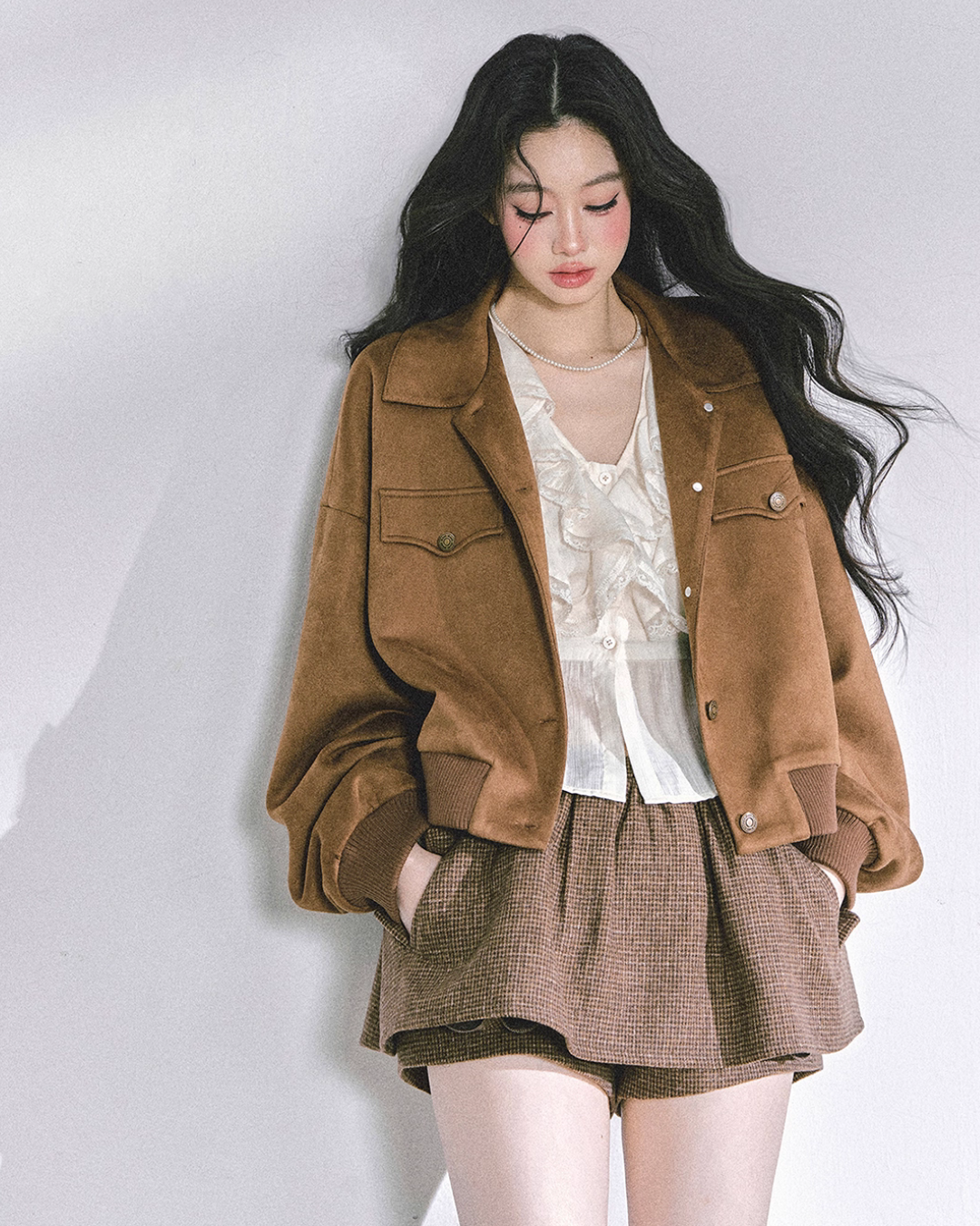 An attractive 3-piece set combining a blouse, jacket, and skirt.