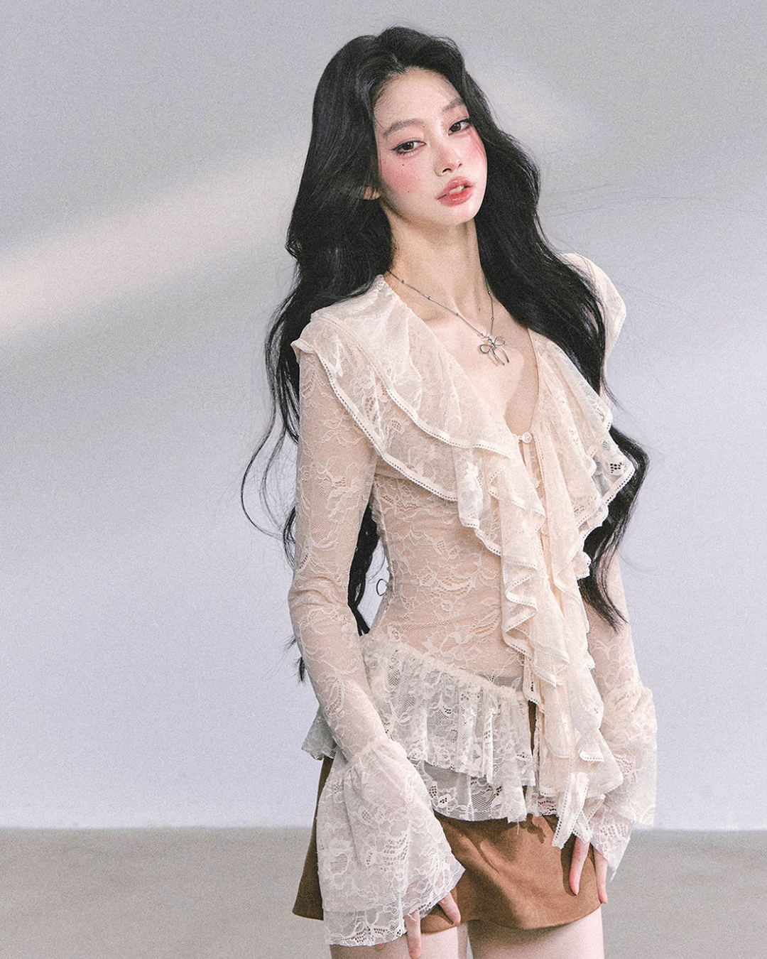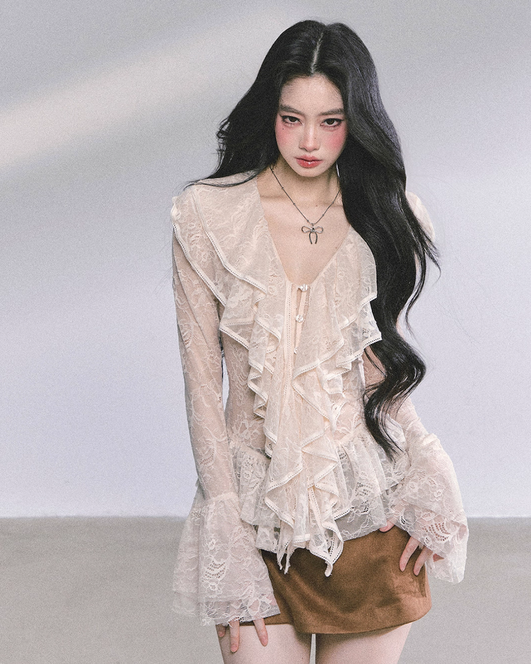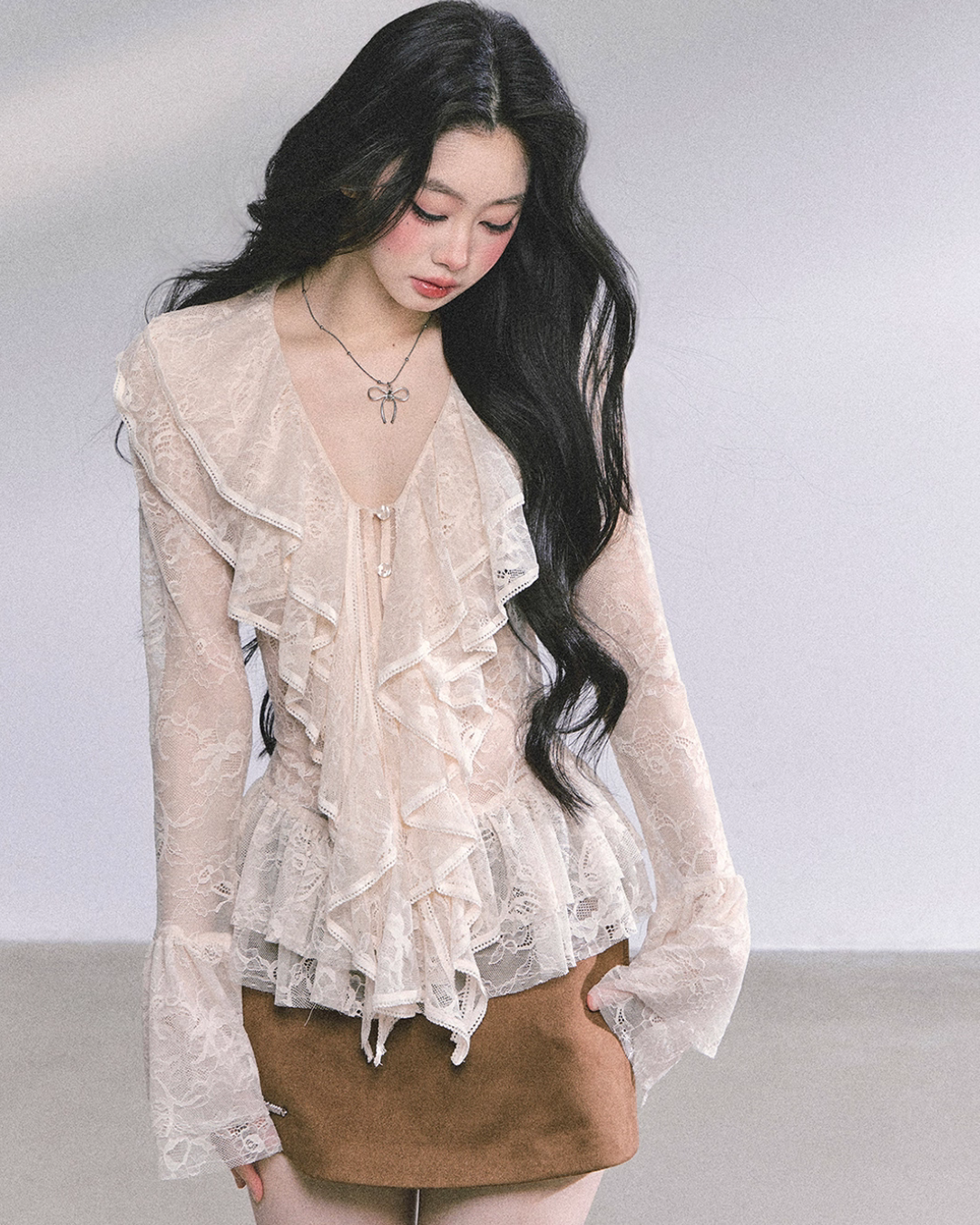 The top has ruffle frills from the neck to the hem, greatly enhancing its elegance.