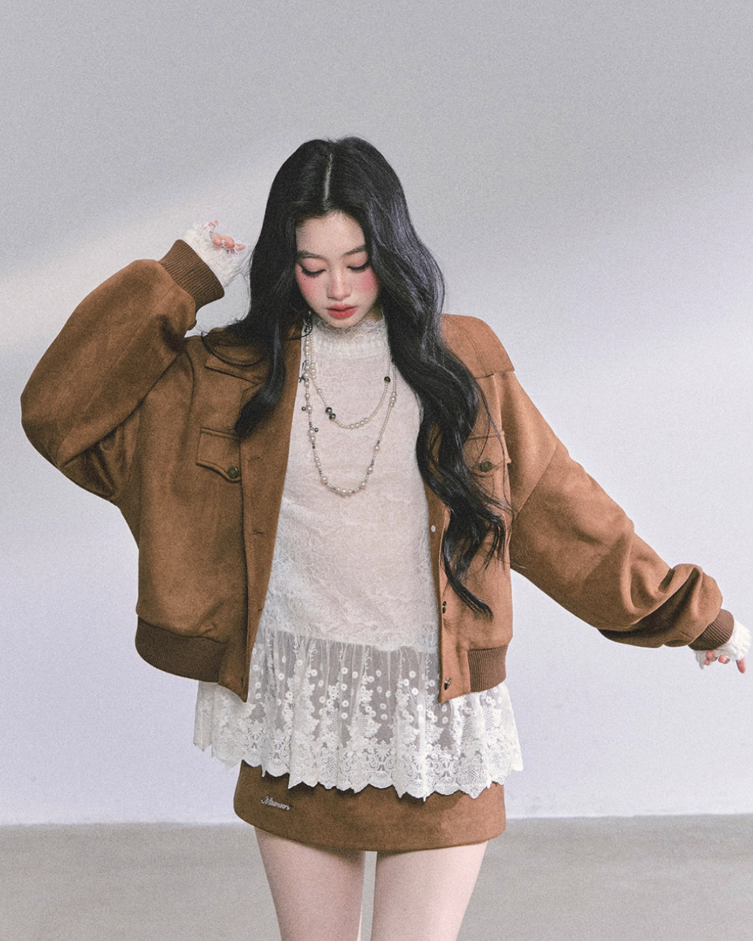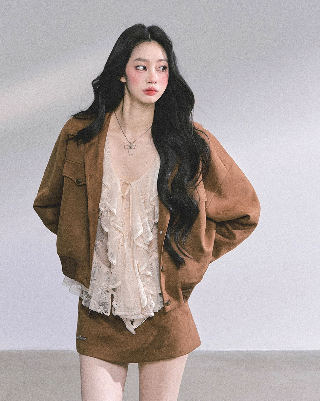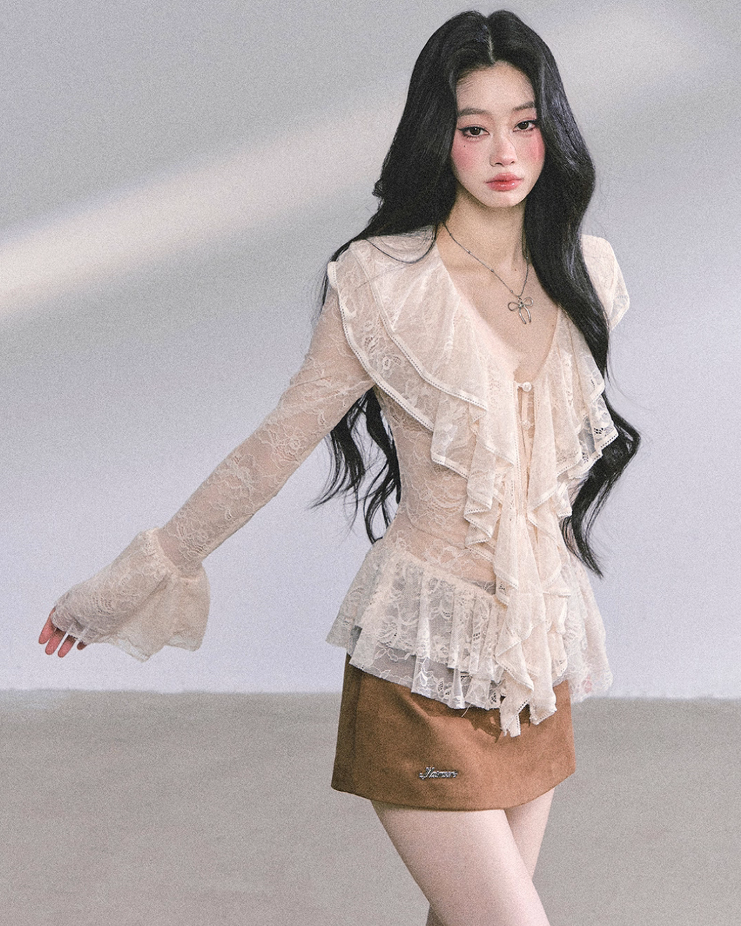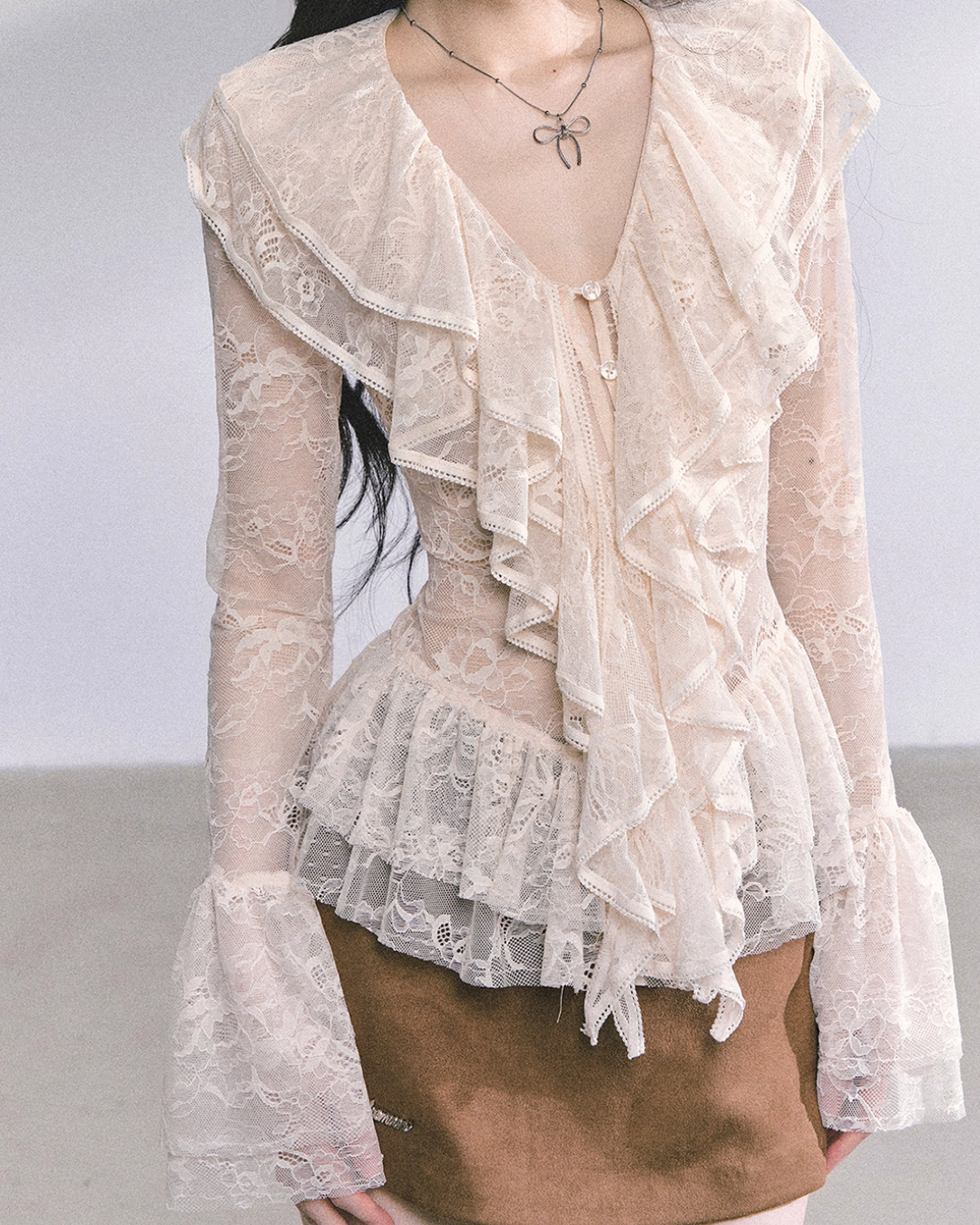 The top has ruffle frills from the neck to the hem, greatly enhancing its elegance.